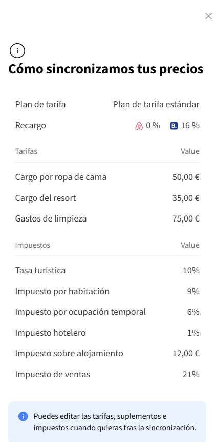 Nota: Se aplica automáticamente un Mark-up del 16% a los precios de tu propiedad en Booking.com. Después de completar la conexión, puedes editar este Mark-up en la configuración de sincronización de Booking.com.