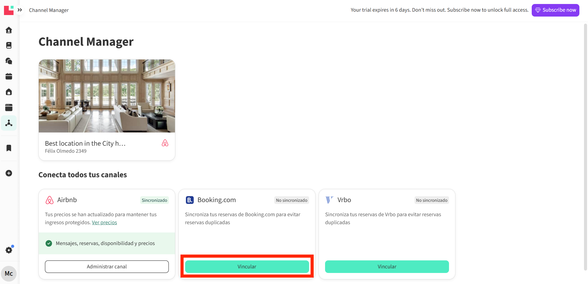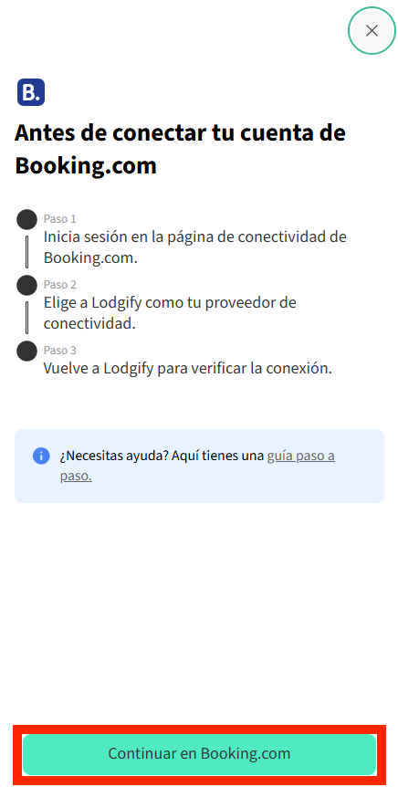 Una vez que hayas completado la conexión con Airbnb, puedes seguir el mismo flujo simplificado para conectarte a Booking.com.