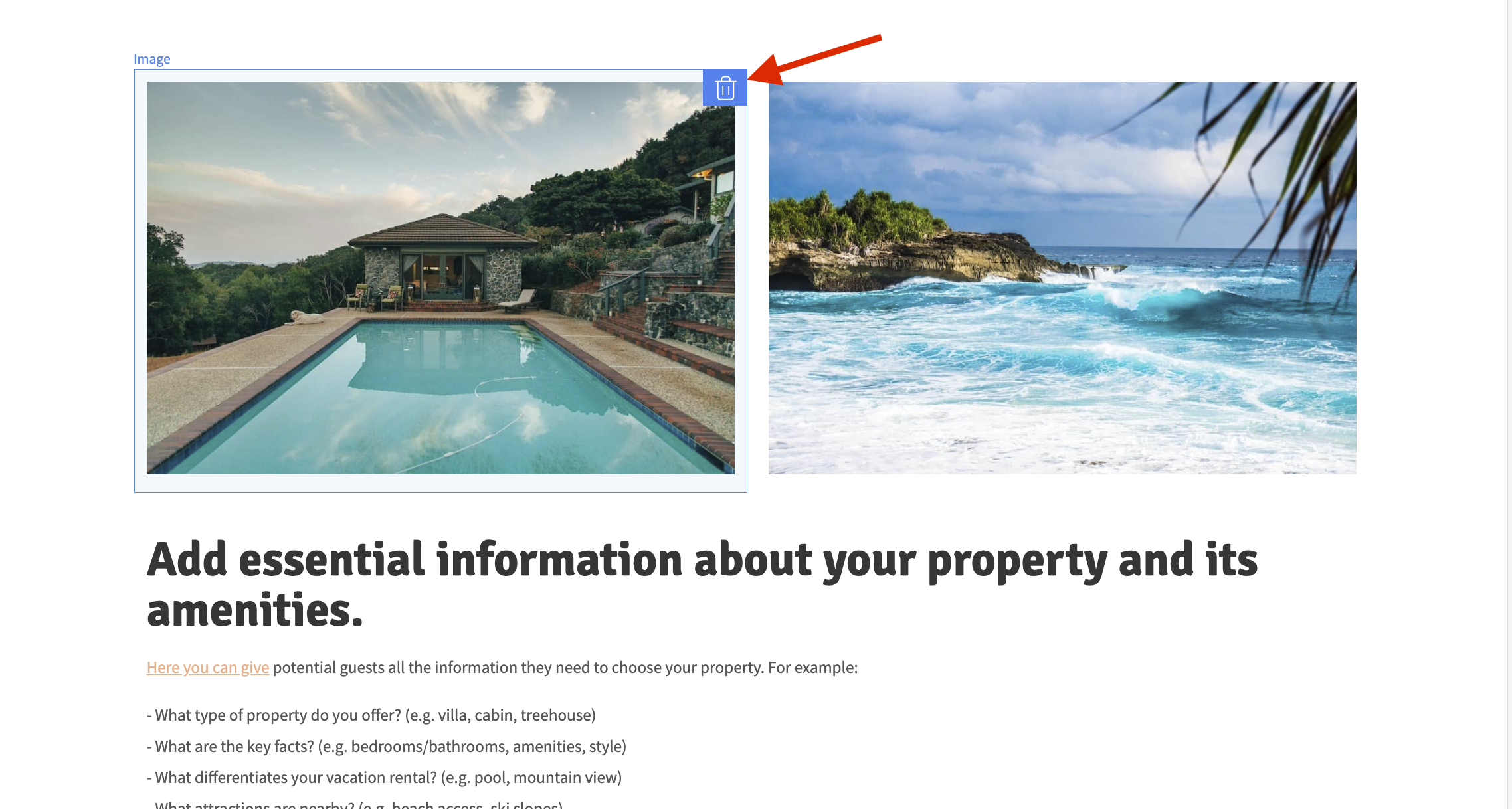 Para eliminar una sección, haz clic en el ícono de la basura que aparece al pasar el ratón por encima de la sección: