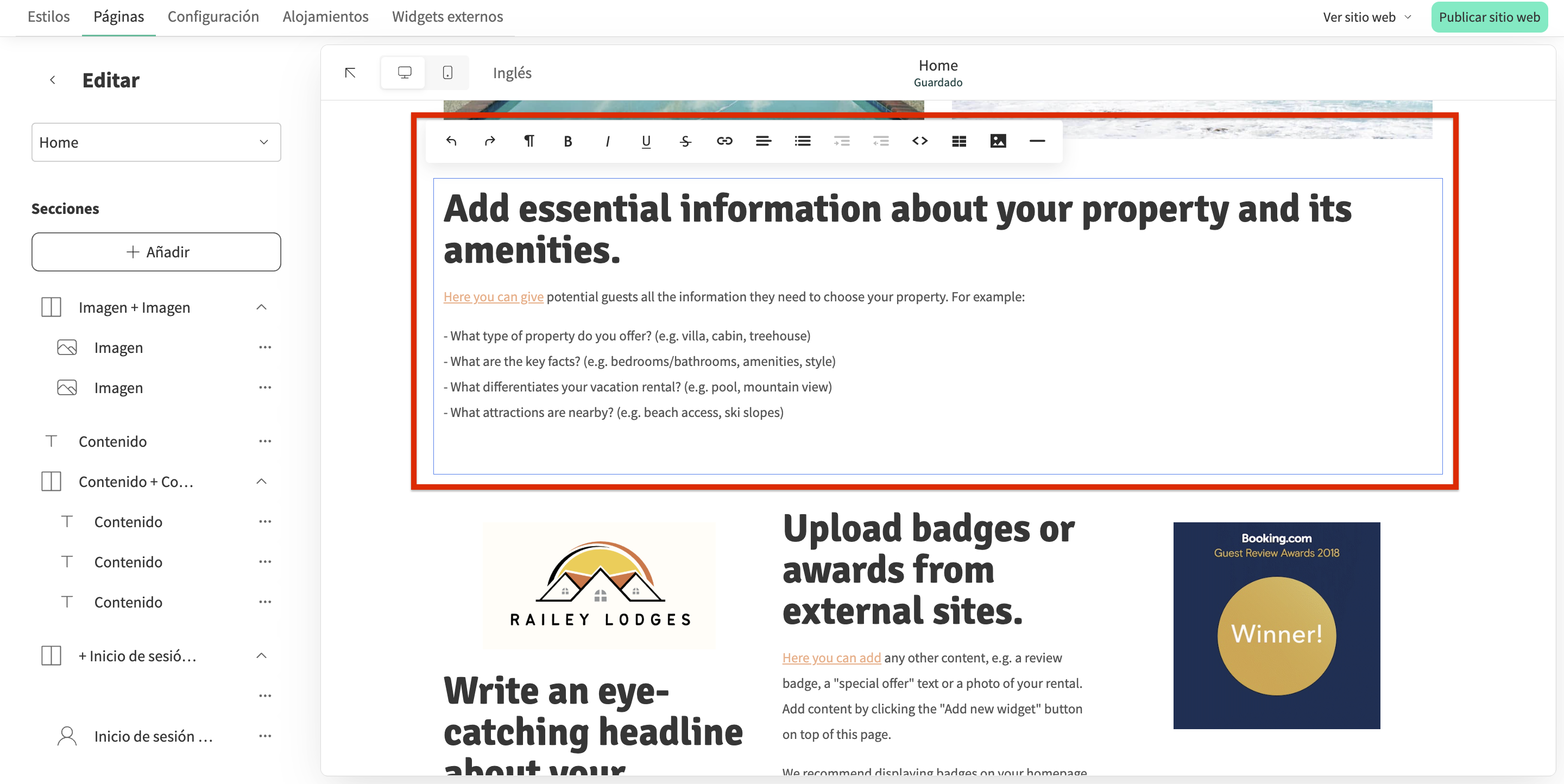Dependiendo de la sección, puede aparecer un editor que te permitirá añadir contenido y realizar cambios en tu sección:
