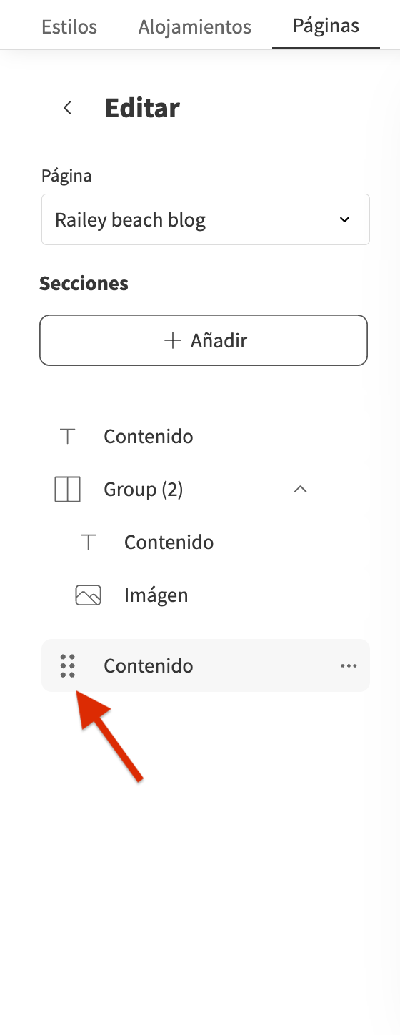 - Esto solo se puede hacer en páginas personalizadas, lo que significa que las páginas predeterminadas (por ejemplo, páginas de Alojamientos) no se pueden arrastrar ni soltar.