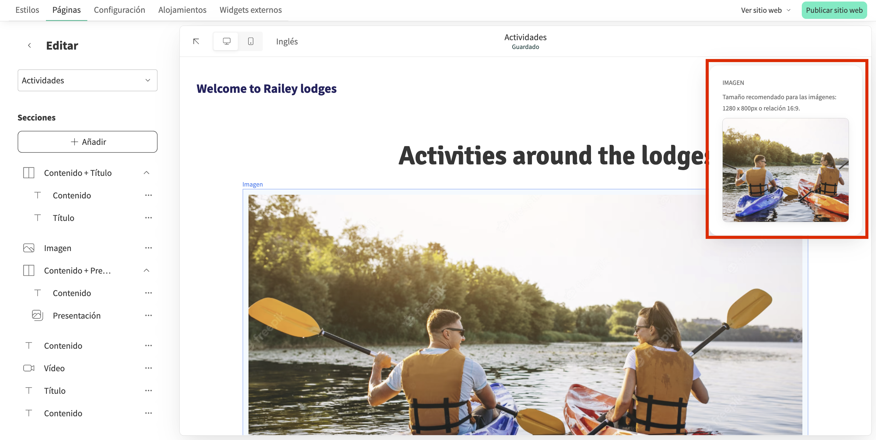 💡 Importante: La sección de tema (Presentación de fotos) en tu página de inicio no puede ser eliminada ni modificada en tamaño. Si no deseas utilizar esta sección, simplemente elimina las imágenes en la presentación. En su lugar, podrías utilizar una imagen de fondo estática.