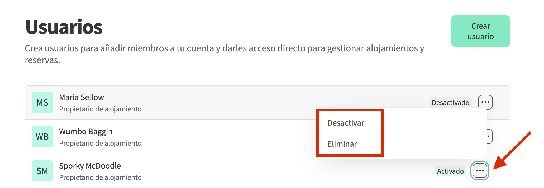 - En la lista de usuarios, haz clic en el icono de los tres puntos junto a Pendiente / Activado y selecciona Eliminar o Desactivar en el menú desplegable.