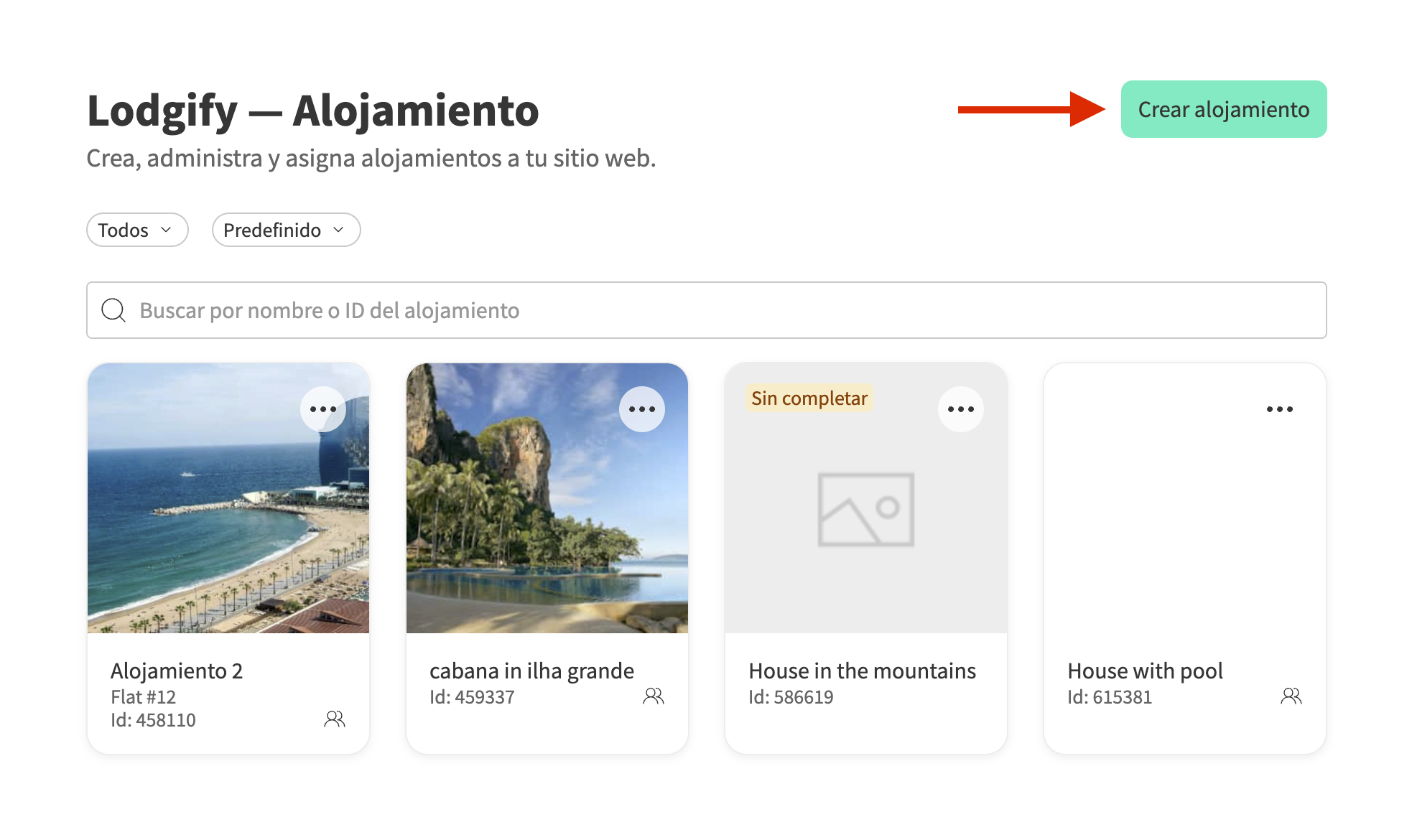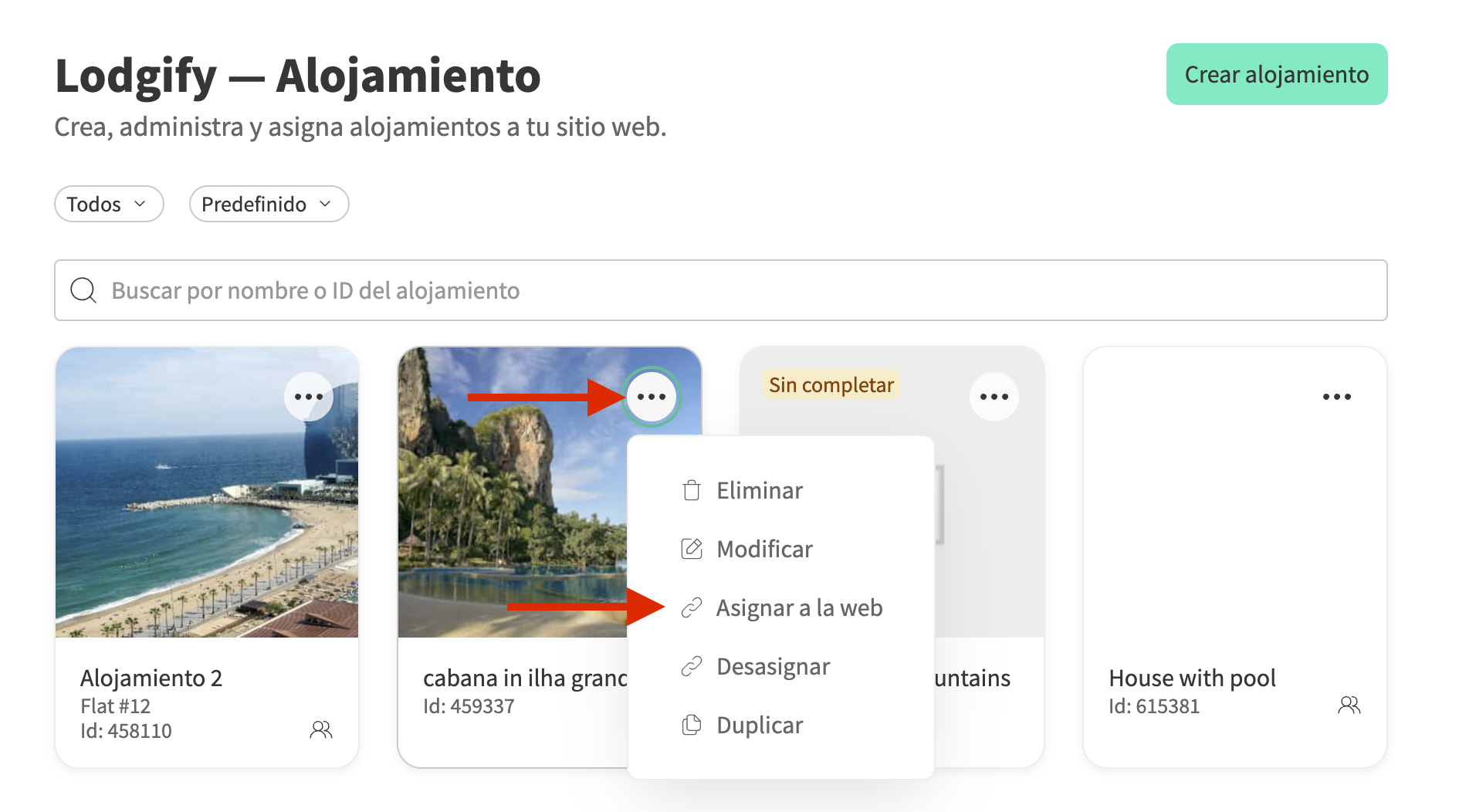 Si deseas crear un nuevo alojamiento sin agregarlo directamente a tu sitio web, puedes hacerlo en la sección Alojamientos. Una vez que hayas terminado y desees publicarlo en tu sitio web, si tienes más de un anuncio, deberás asignarlo al sitio web.