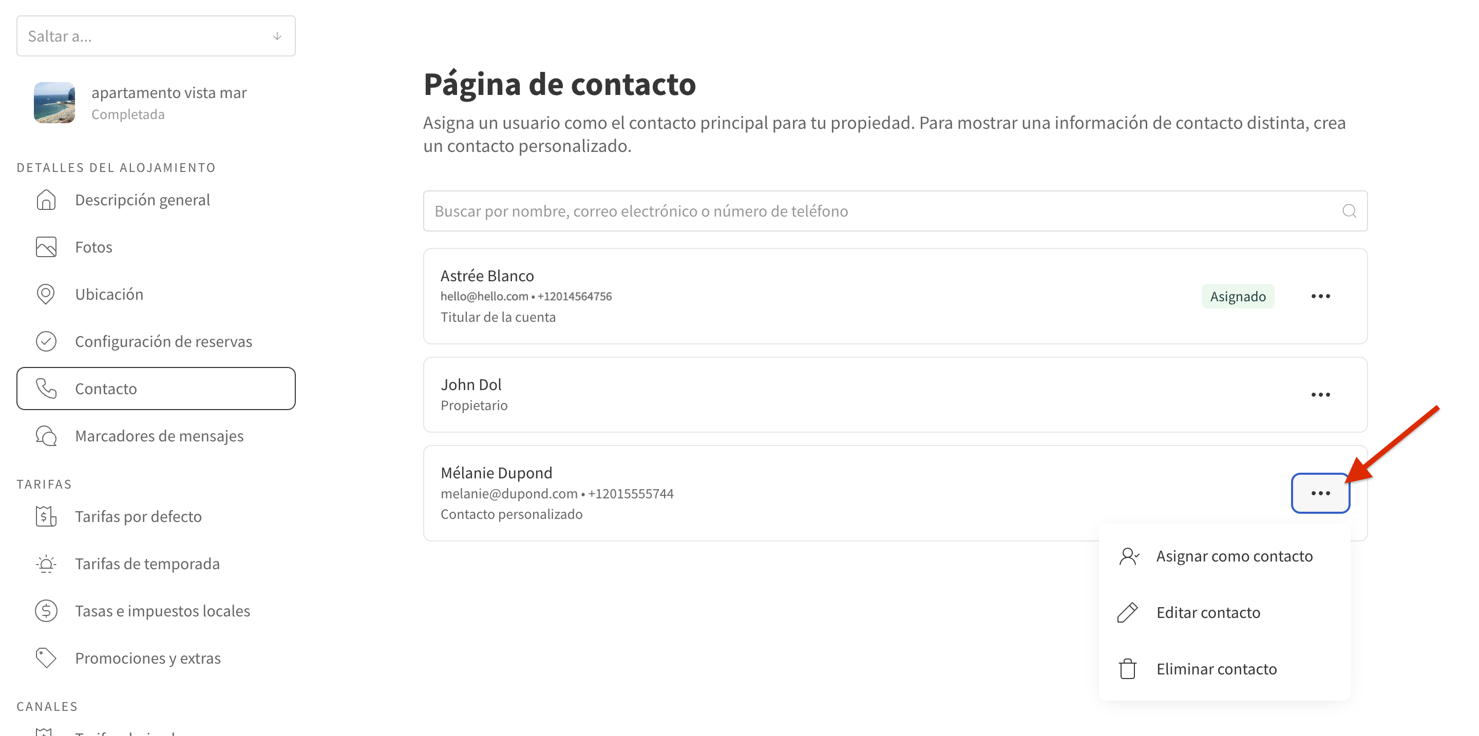 - Elige el alojamiento donde quieres cambiar los detalles de contacto y selecciona Contacto.