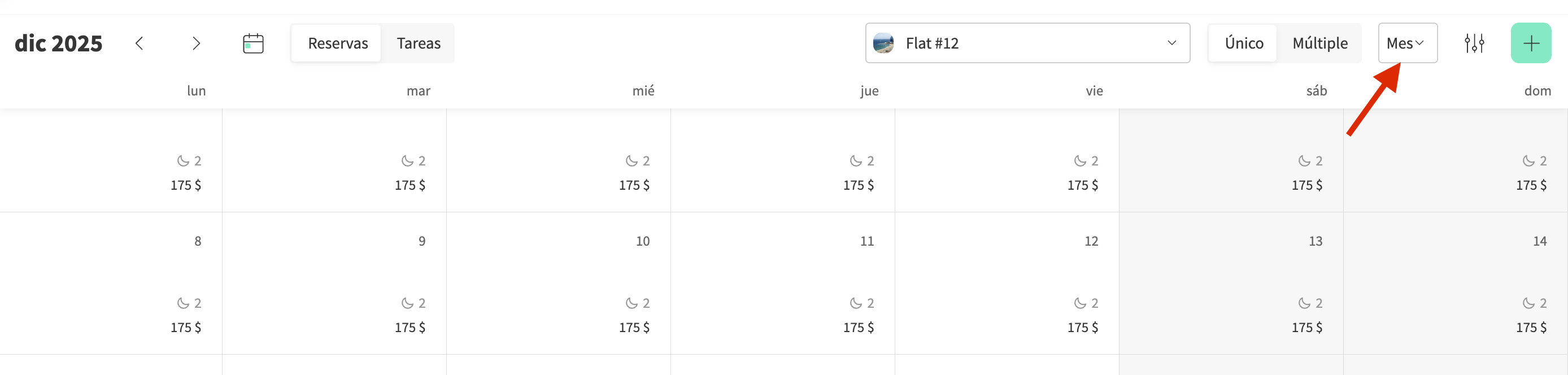 La vista Única muestra una vista detallada mensual o anual de un solo alojamiento, mientras que la vista Múltiple te permite ver una vista general de dos semanas de varios alojamientos al mismo tiempo.