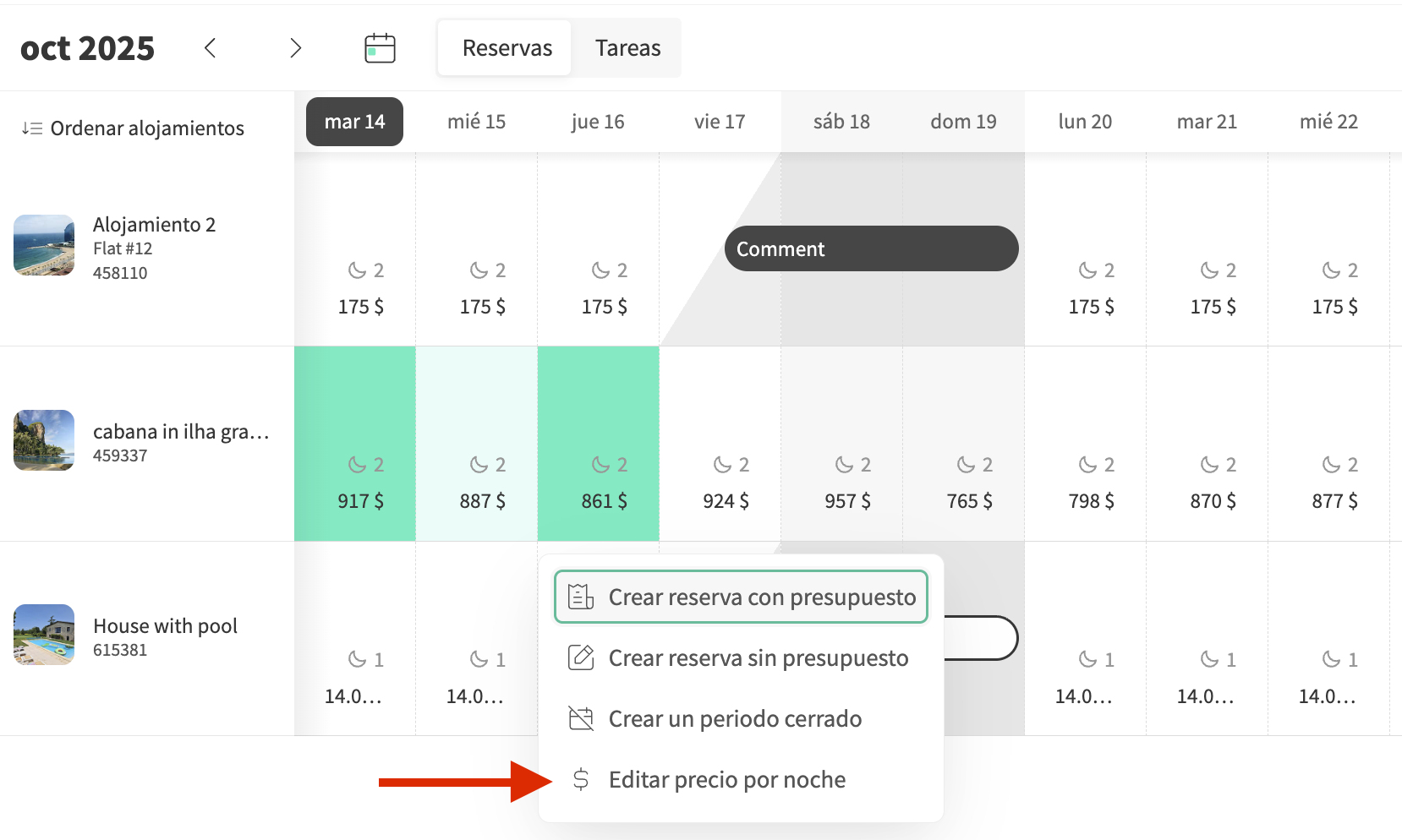 | Ordenar alojamientos | Múltiple | En la parte superior izquierda del calendario, puedes ordenar y elegir qué alojamientos quieres ver. Al seleccionar Ordenar alojamientos, puedes ocultar alojamientos o reorganizar el orden en el que aparecen. Esta información se guarda en tu navegador, por lo que si usas un dispositivo diferente, tus preferencias de orden no serán visibles. |