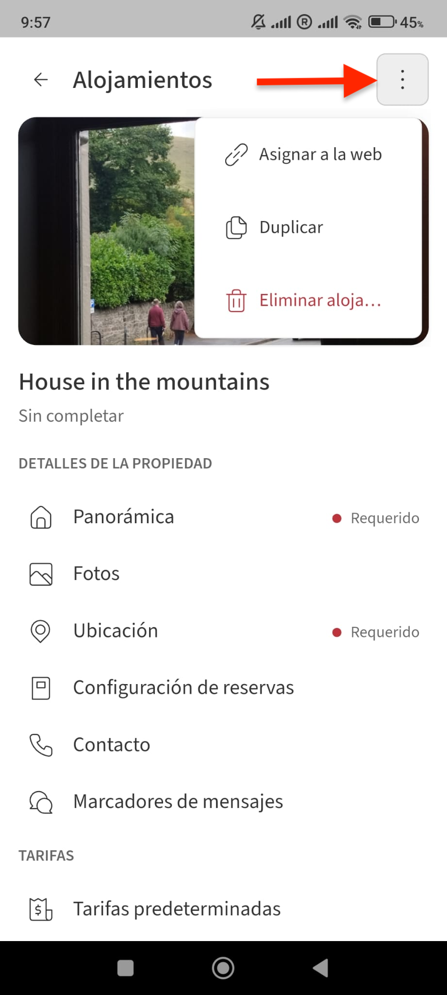 - Haz clic en los tres puntos en la esquina superior derecha del alojamiento que quieres eliminar.