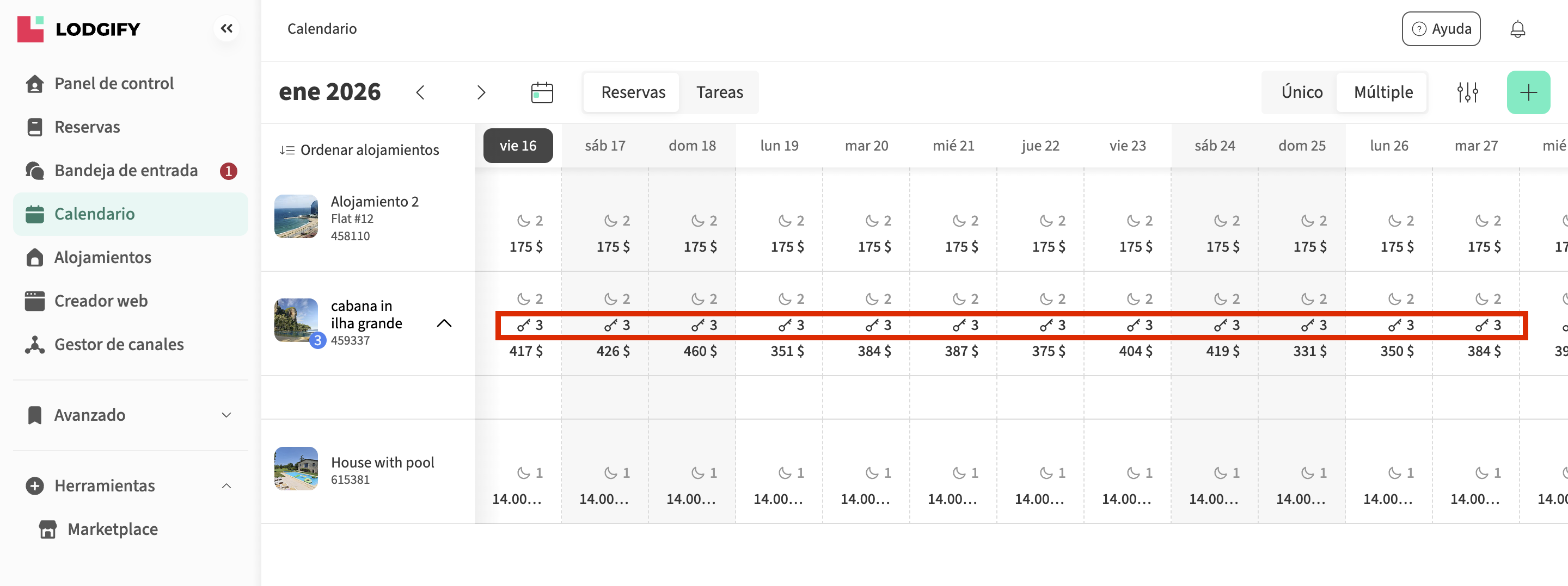 Aquí es cómo las unidades reservables aparecerán en tu calendario de Lodgify: obtendrás una línea por alojamiento con el número de unidades asociado: