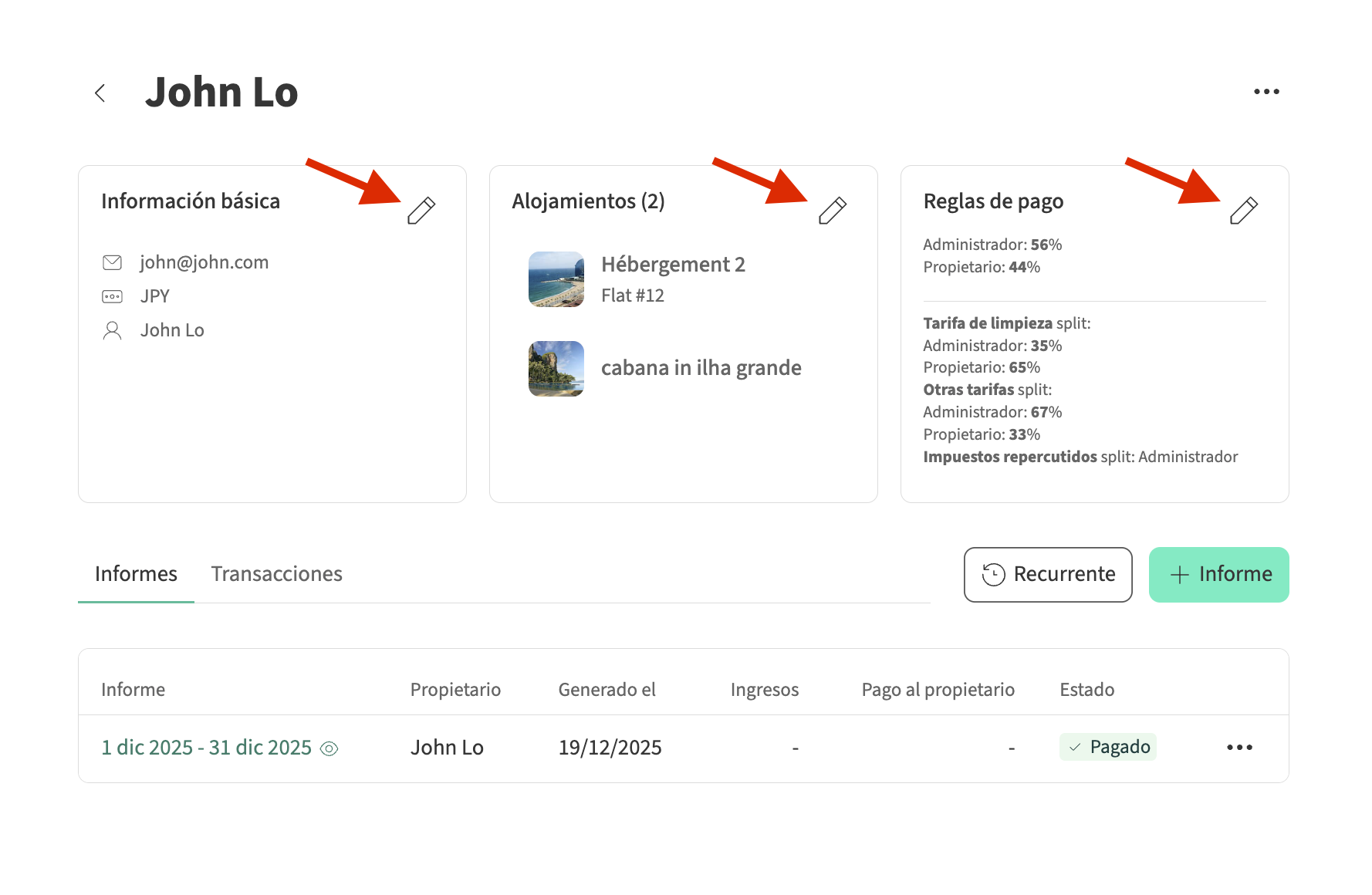 Para editar la información del perfil, los alquileres asociados o las reglas de pago de un propietario, sigue estos pasos: