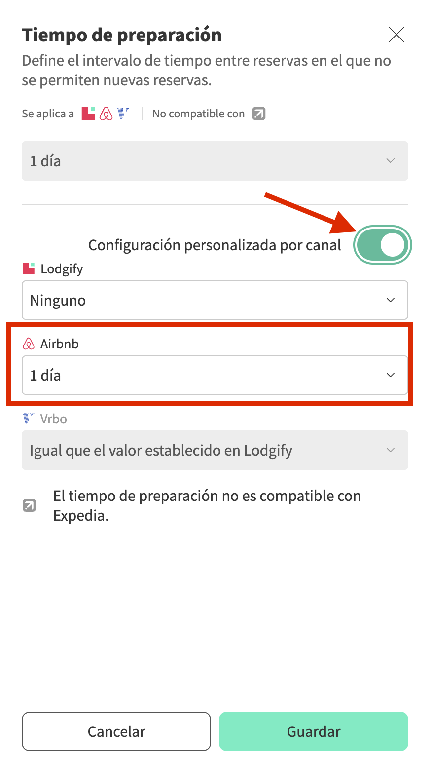 Si quieres usar un tiempo de preparación diferente para Airbnb, puedes hacerlo seleccionando la opción Configuración personalizada por canal dentro de los ajustes de tiempo de preparación:
