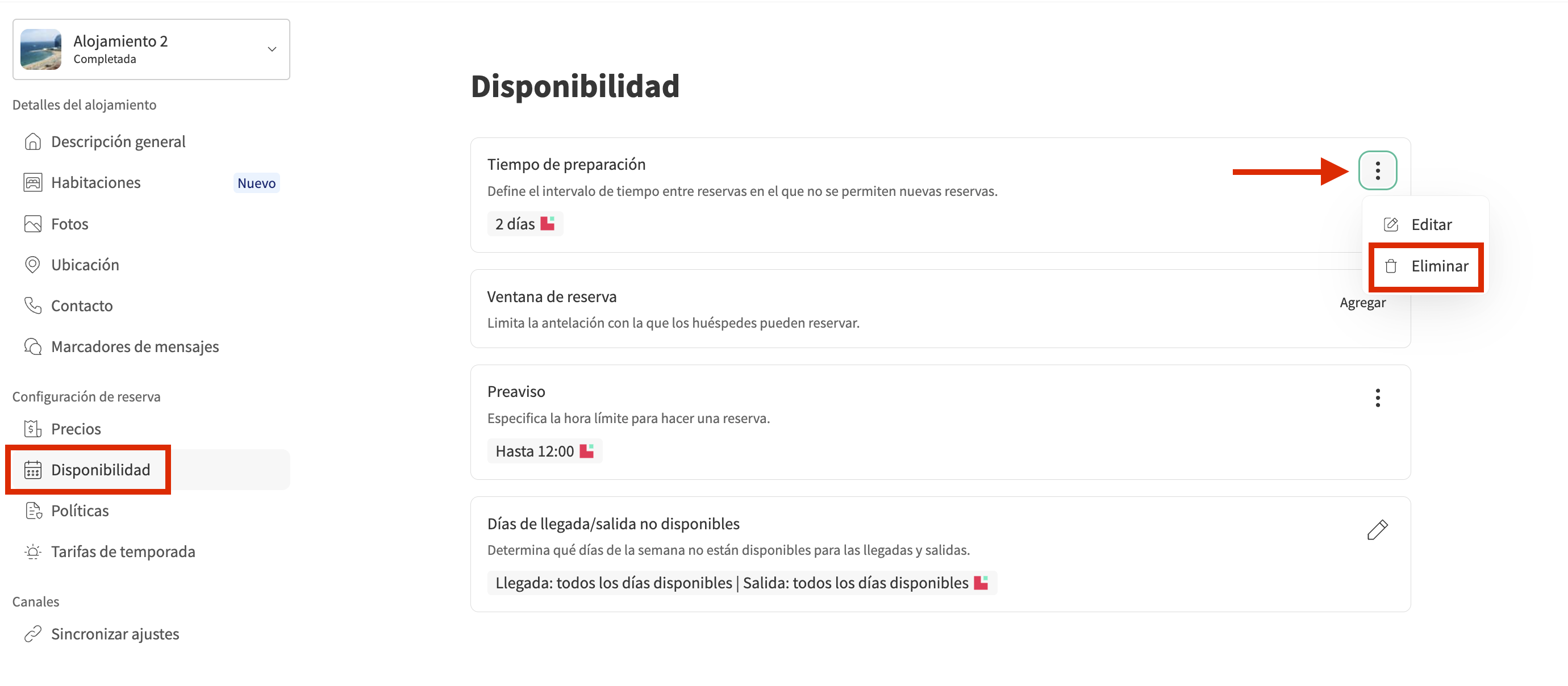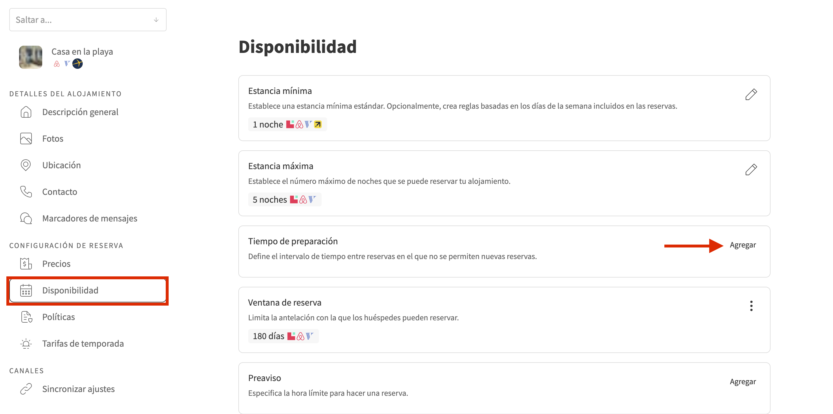Para establecer un tiempo de preparación para tu alojamiento, necesitas hacerlo en los ajustes de reserva del alojamiento.