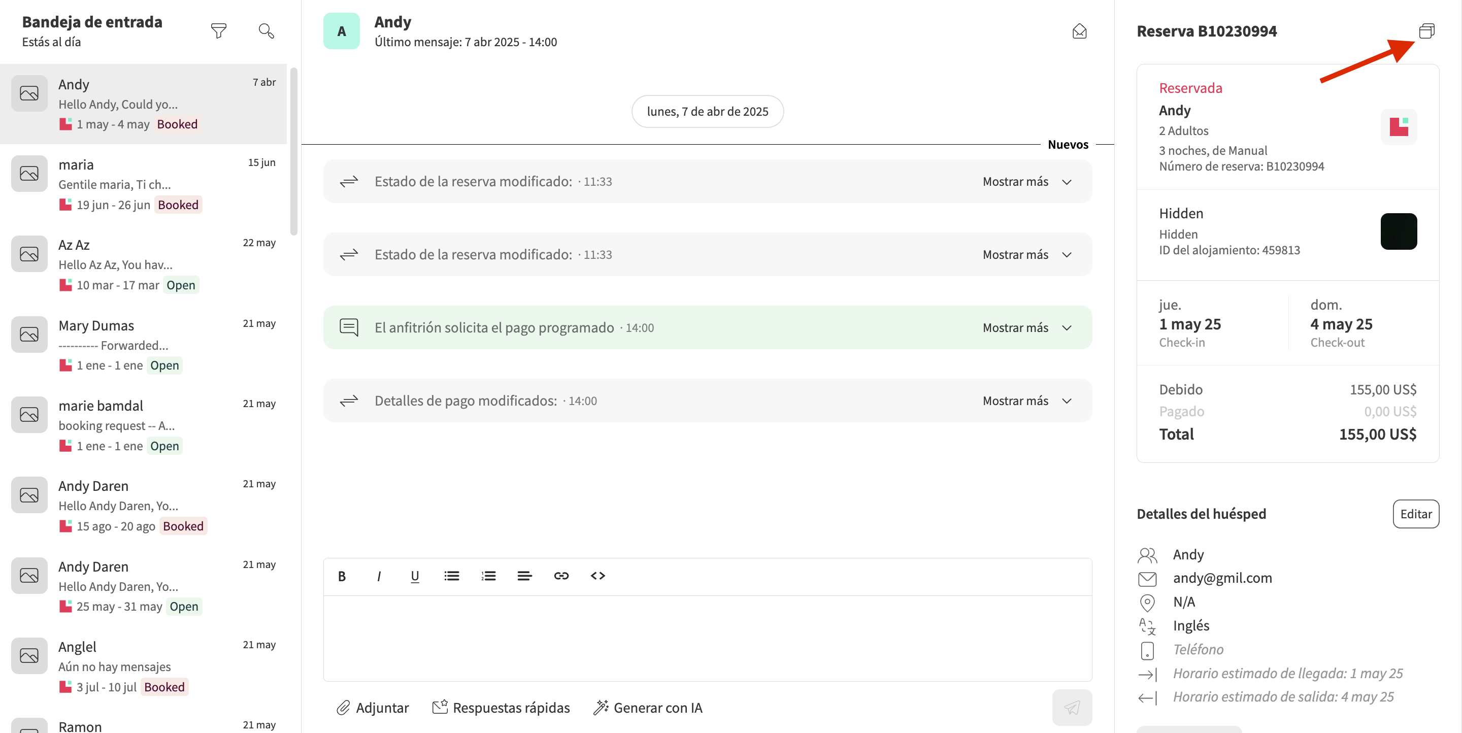 Siempre que abras un mensaje, vendrá acompañado de cualquier detalle relevante de la reserva, que se mostrará a la derecha del contenido del mensaje. Para ver o administrar más detalles de la reserva, haz clic en el ícono 'abrir reserva' a la derecha del ID de la reserva.