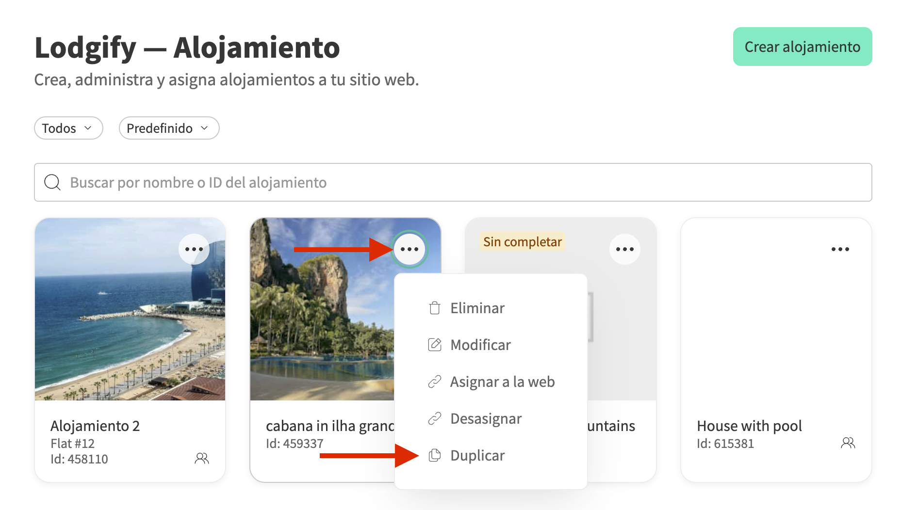 Ubica el alojamiento que deseas duplicar. En la esquina superior derecha de la imagen, haz clic en los tres puntos y selecciona Duplicar.