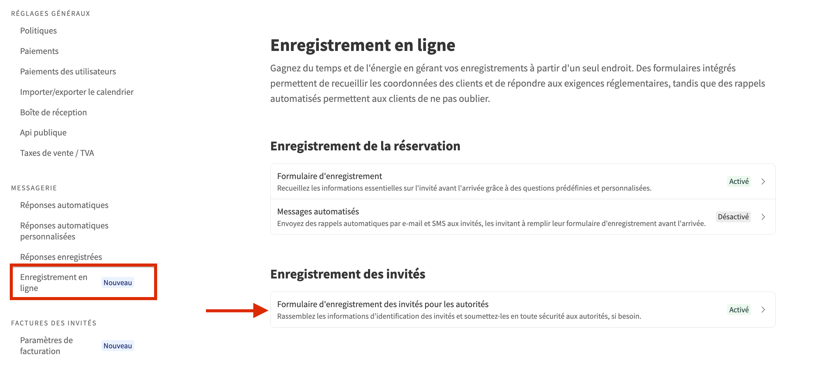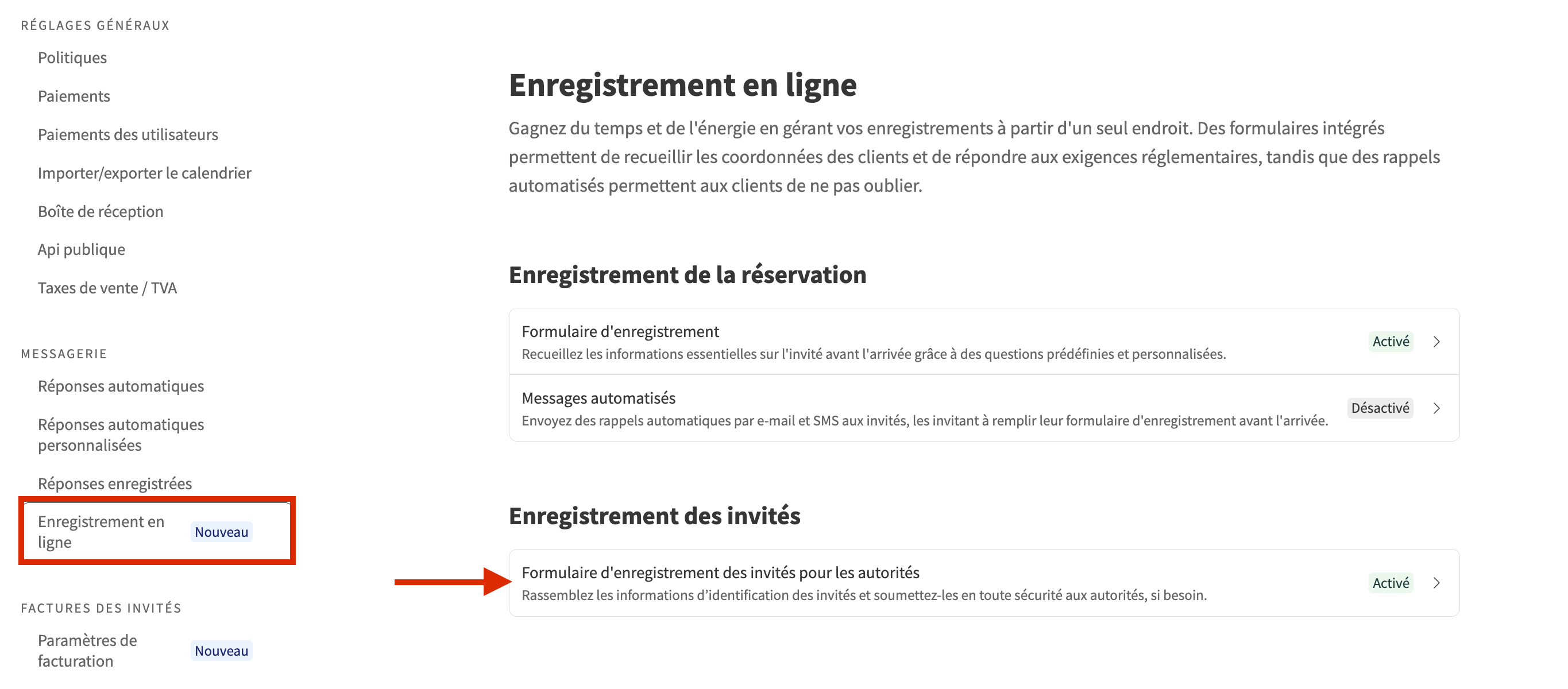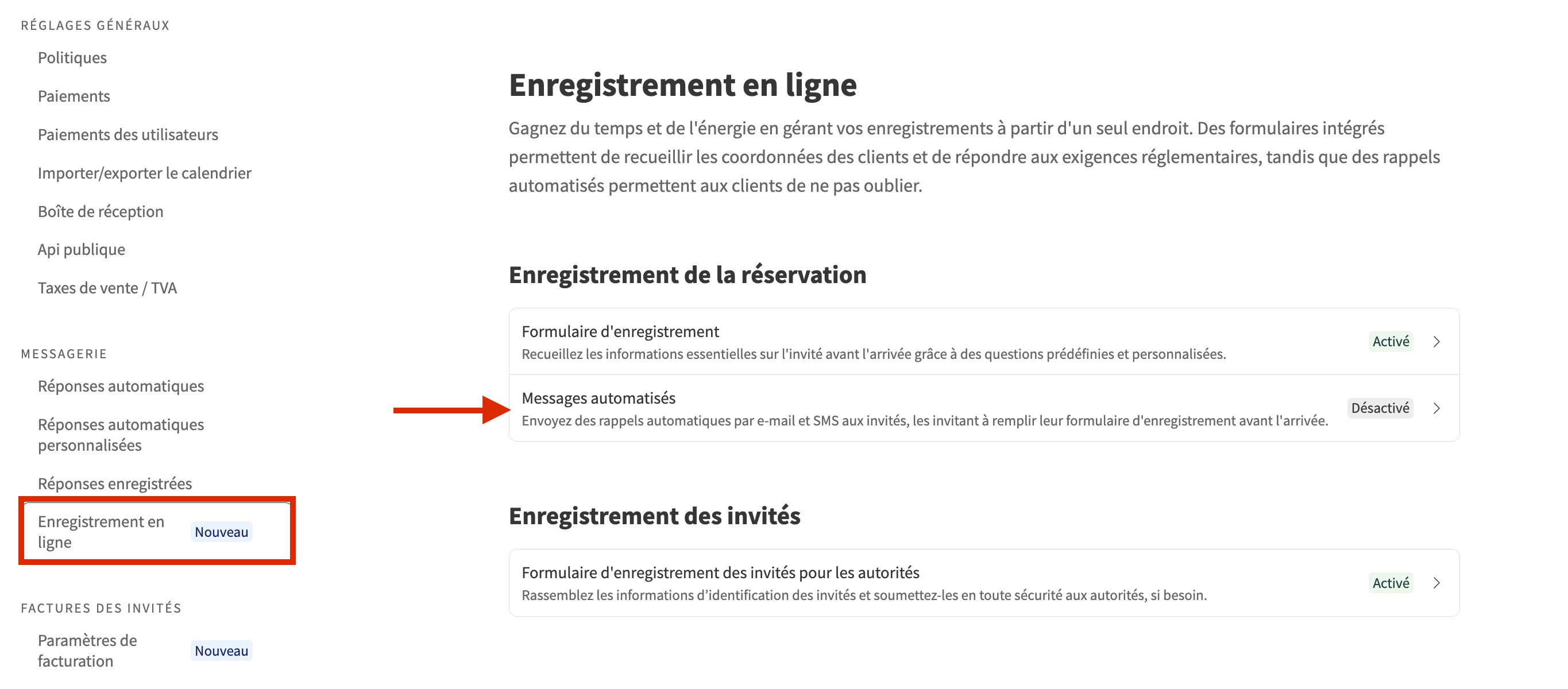 Si le formulaire de check-in de la réservation est activé, le formulaire d'enregistrement sera envoyé avec celui-ci. Lors de l'activation du formulaire de check-in, vous pouvez choisir d’activer les Messages automatisés. Si vous le faites, le formulaire d'enregistrement sera envoyé automatiquement en même temps que le formulaire de check-in, en suivant les règles d’envoi définies dans vos paramètres de messages automatisés.