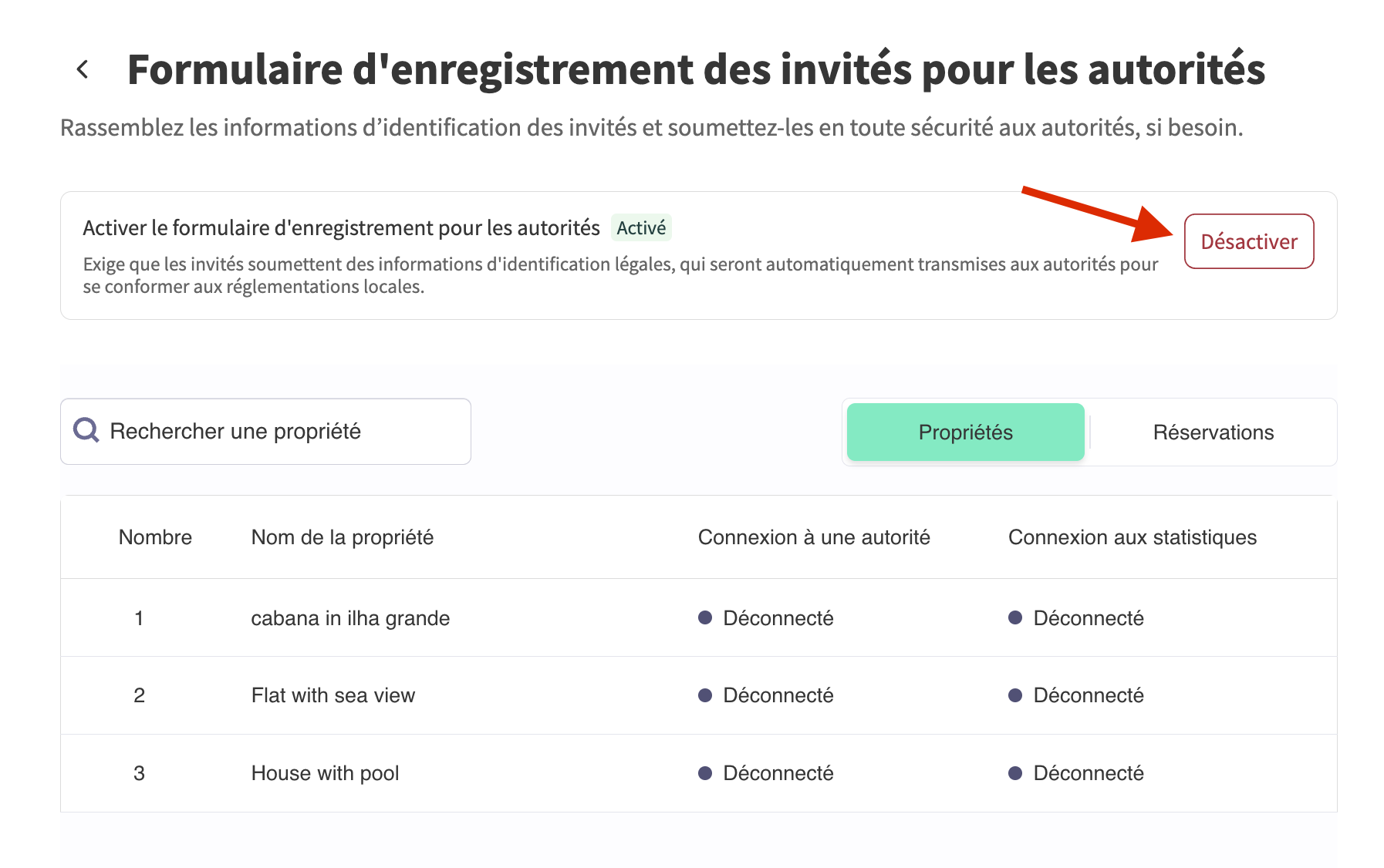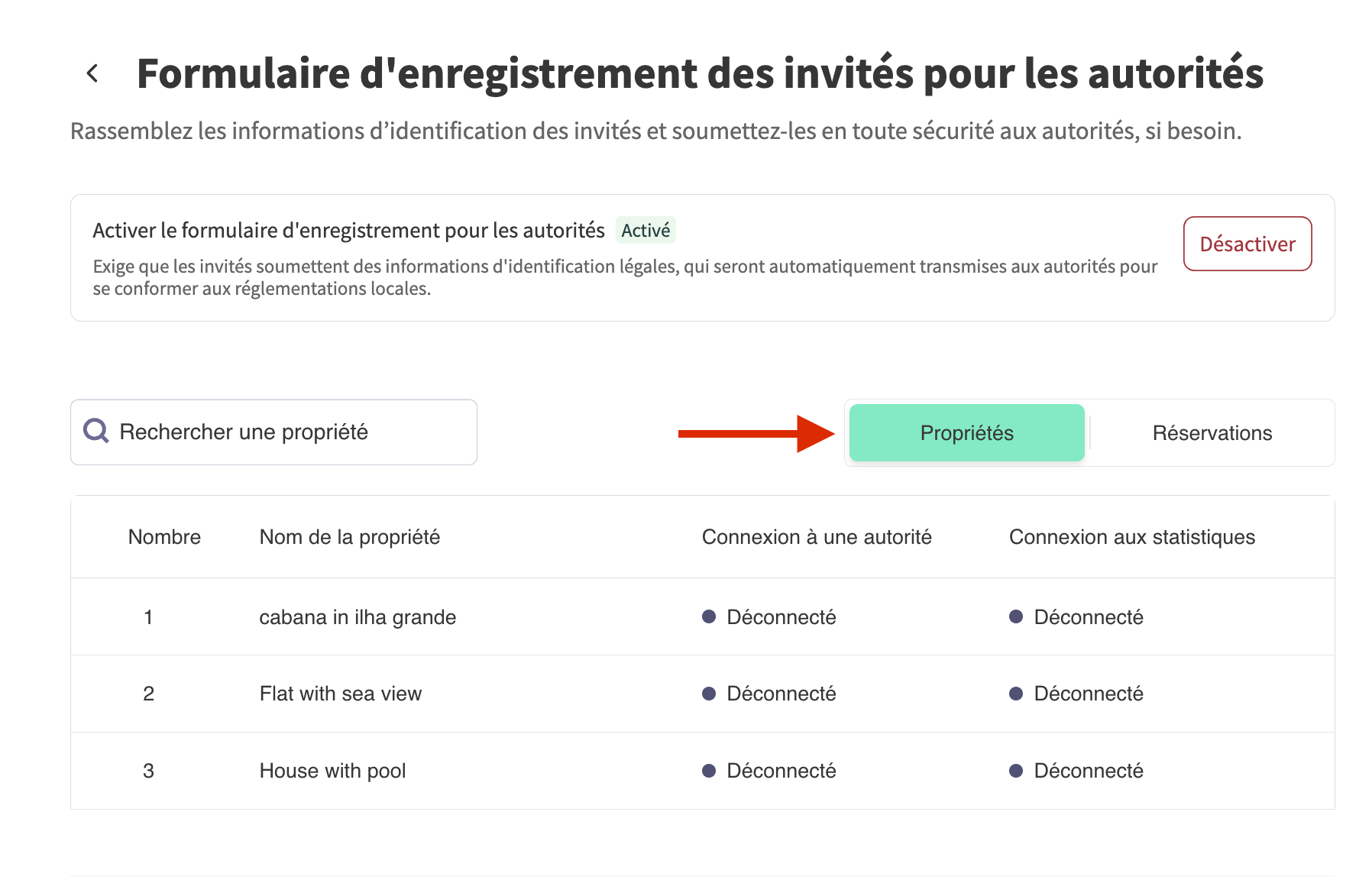 Si vous venez d’activer l’enregistrement des invités, ajouté de nouveaux hébergements ou reconnecté votre compte, vous devrez établir la connexion entre vos hébergements et les autorités locales. Pour ce faire, suivez ces étapes :