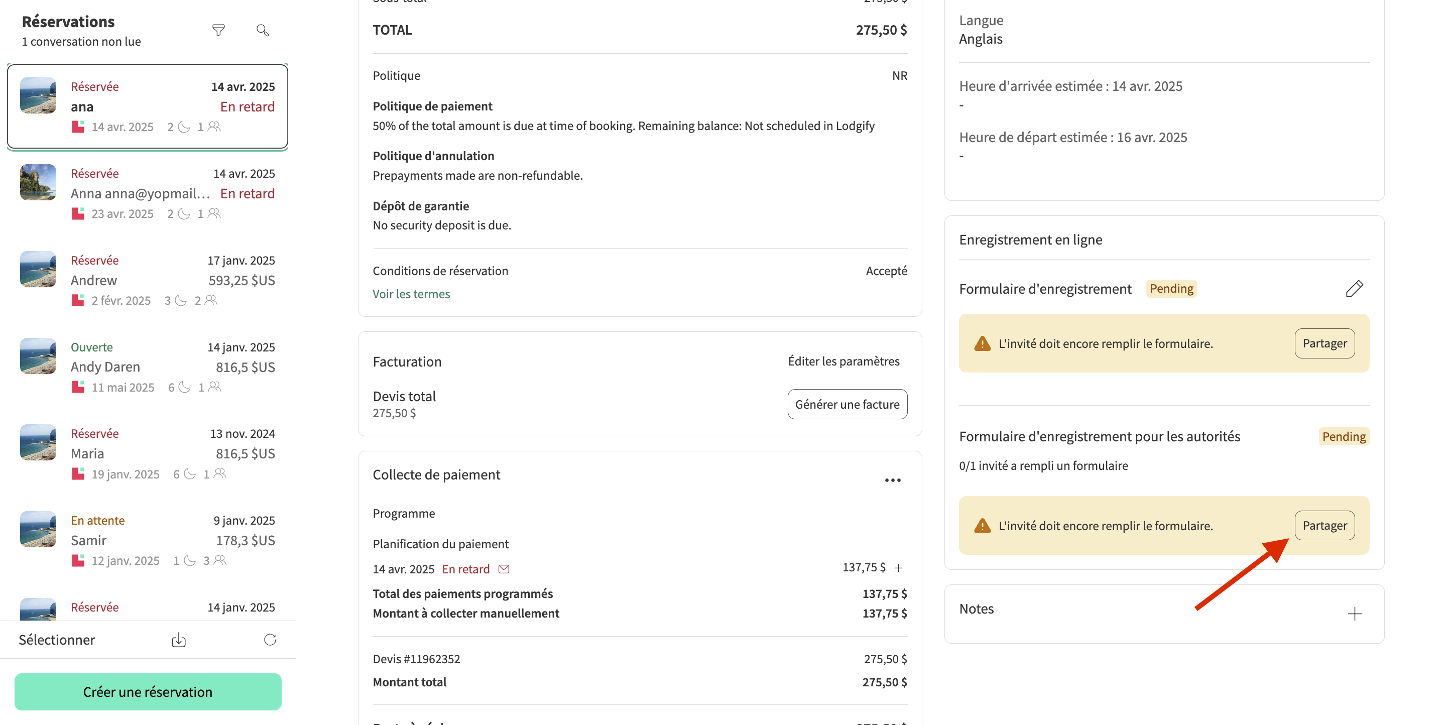 Les réservations avec des informations d’invités entièrement complétées afficheront toujours les données dans les détails de la réservation. En revanche, les anciennes réservations avec des données partielles perdront les informations saisies, et vous devrez demander les détails à nouveau manuellement.