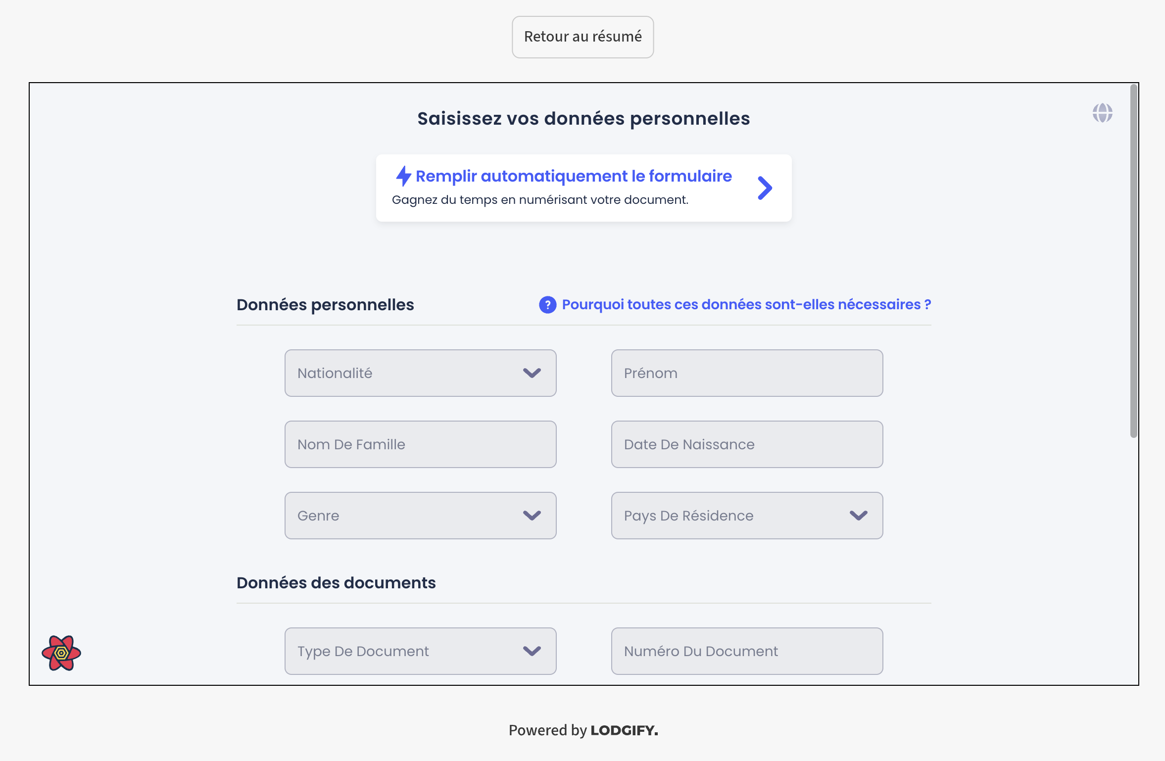 Vous pouvez activer la fonctionnalité de formulaire d'enregistrement des invités pour automatiser la collecte des informations exigées par les autorités locales. Elle s'adapte aux exigences légales de chaque région afin de garantir que vous collectez les bonnes informations. Une fois les données collectées, elles sont automatiquement envoyées aux autorités compétentes, vous faisant gagner du temps tout en assurant votre conformité.