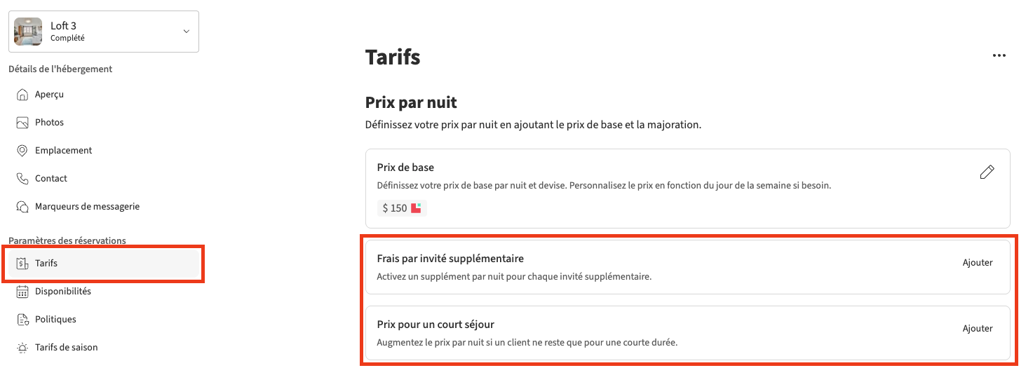 - Occupation — ajoutés au prix par nuit lorsque le nombre d'invités dépasse votre seuil.