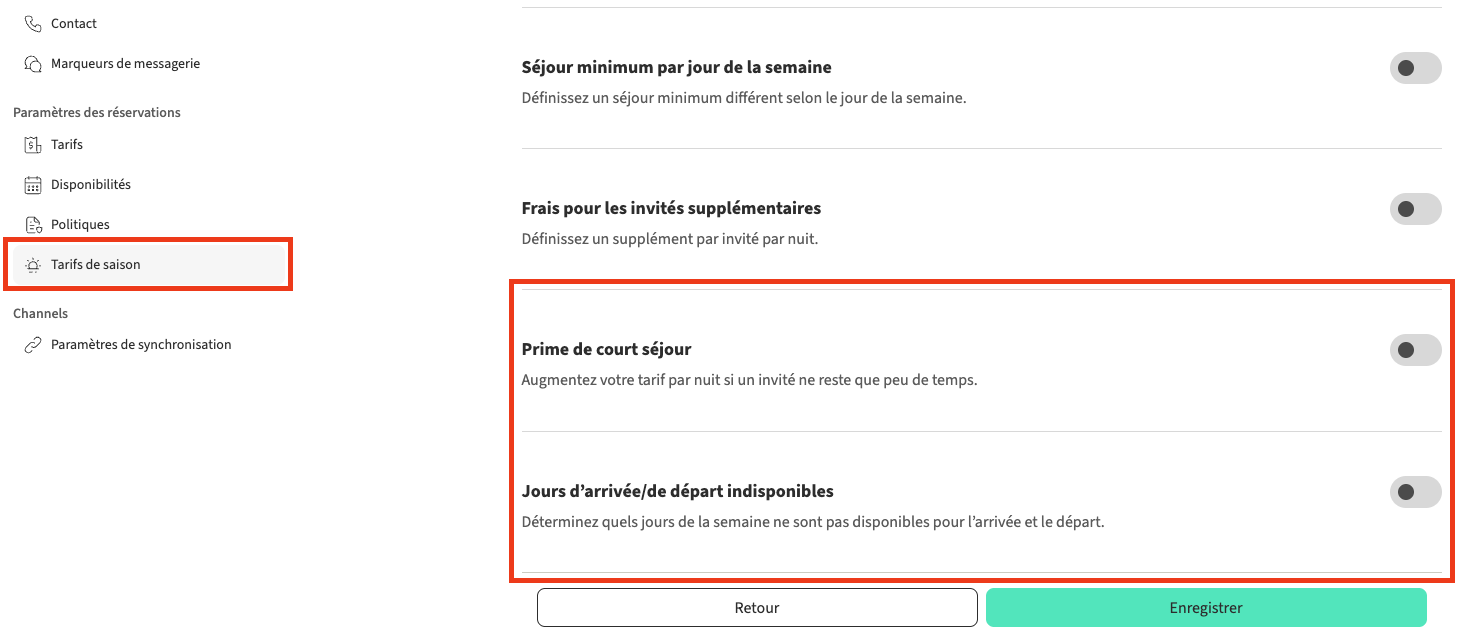 - Dans la section Tarifs - pour s'appliquer aux dates non incluses dans les tarifs de saison