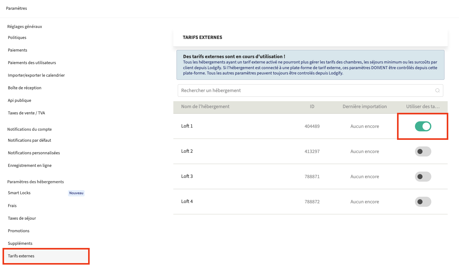 Si le bouton est activé pour l'hébergement, cela signifie que des tarifs externes sont utilisés.