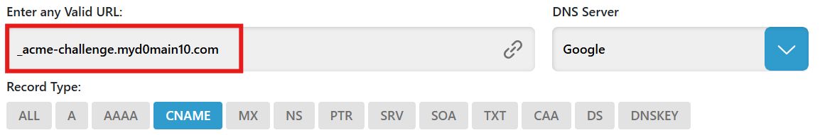 - Effectuez une recherche en utilisant la valeur CNAME fournie par Lodgify, combinée avec votre domaine.