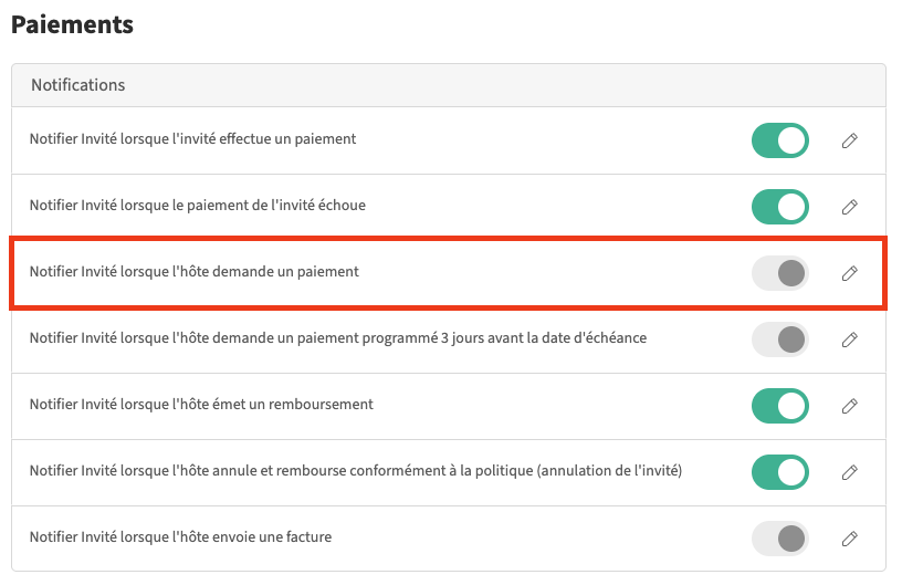 💡 Note : Vous pouvez modifier/consulter le contenu de la notification de demande de paiement dans la section Notifications personnalisées de votre compte. Cliquez sur l'icône de crayon à côté de la notification « Notifier Invité lorsque l'hôte demande un paiement » :