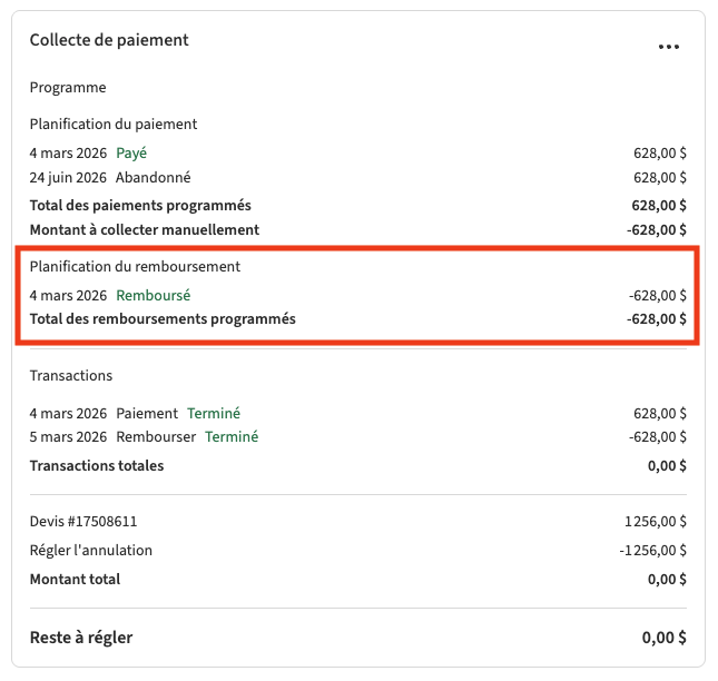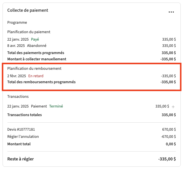 Si les Remboursements automatiques ne sont pas activés, le système ne traitera pas le remboursement de lui-même. Au lieu de cela, le remboursement sera marqué comme Programmé, et vous devrez l'émettre manuellement.