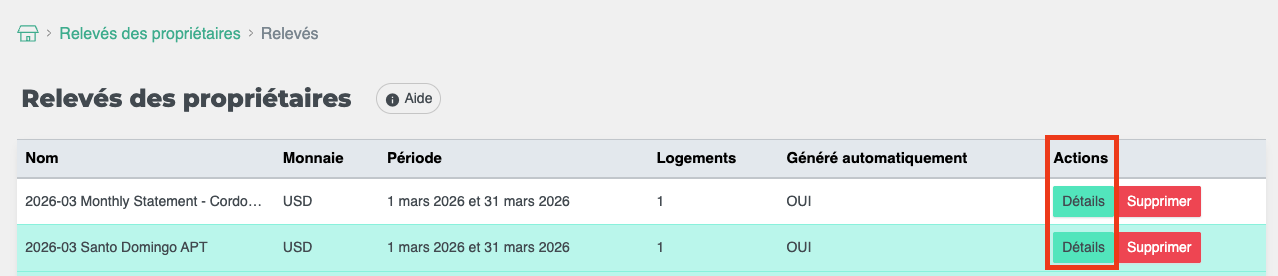 Rendez-vous dans la section Relevés et localisez le relevé pour l'hébergement et les dates correspondantes.
