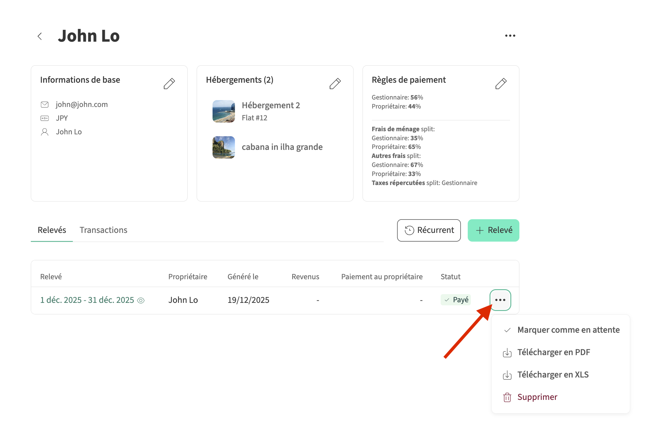 - Cliquez sur le propriétaire associé, puis sélectionnez les trois points à droite du relevé que vous souhaitez marquer comme payé et cliquez sur Marquer comme payé.