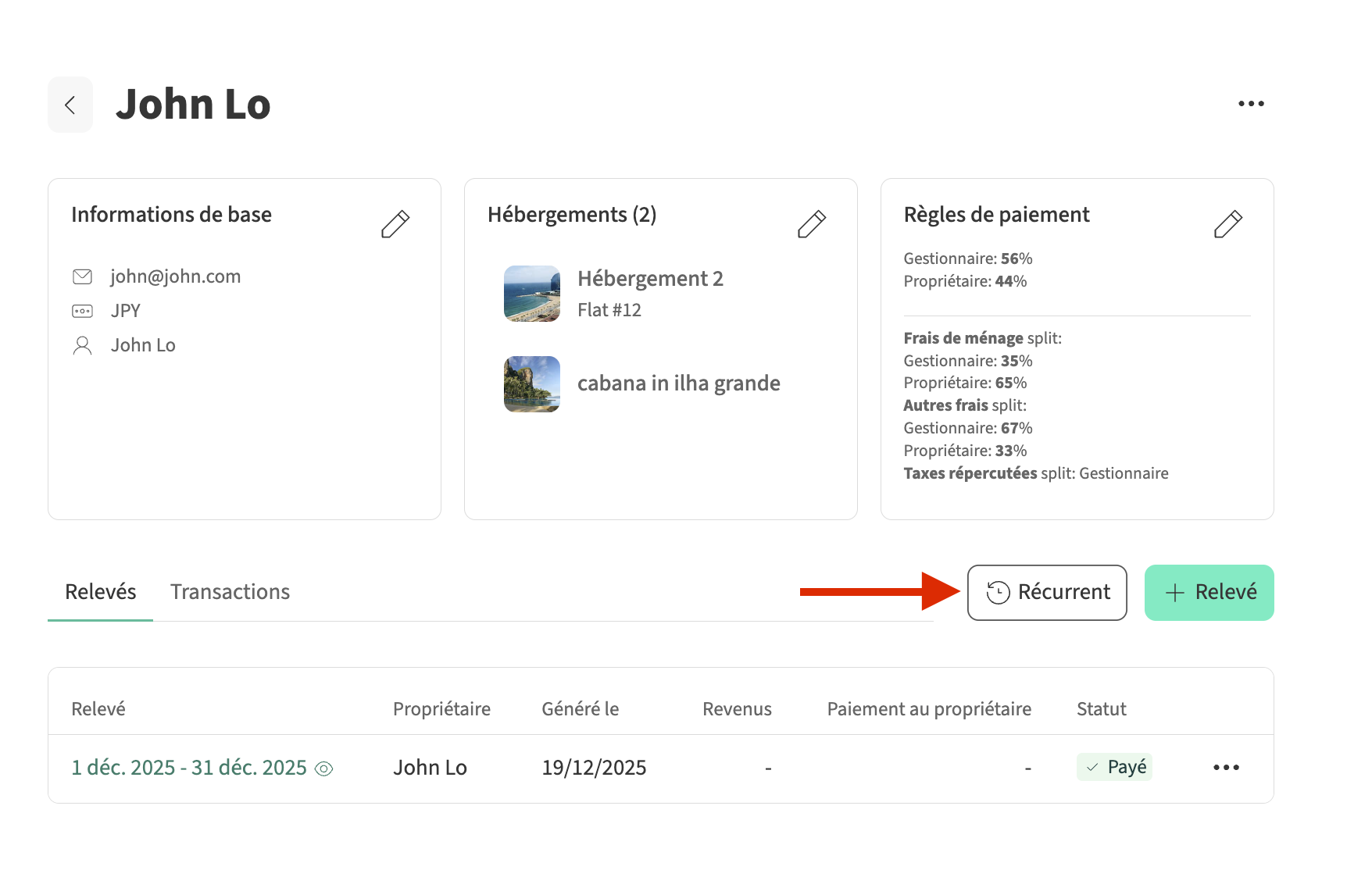 - Cliquez sur le propriétaire dont vous souhaitez gérer le relevé récurrent, puis sélectionnez Récurrent.