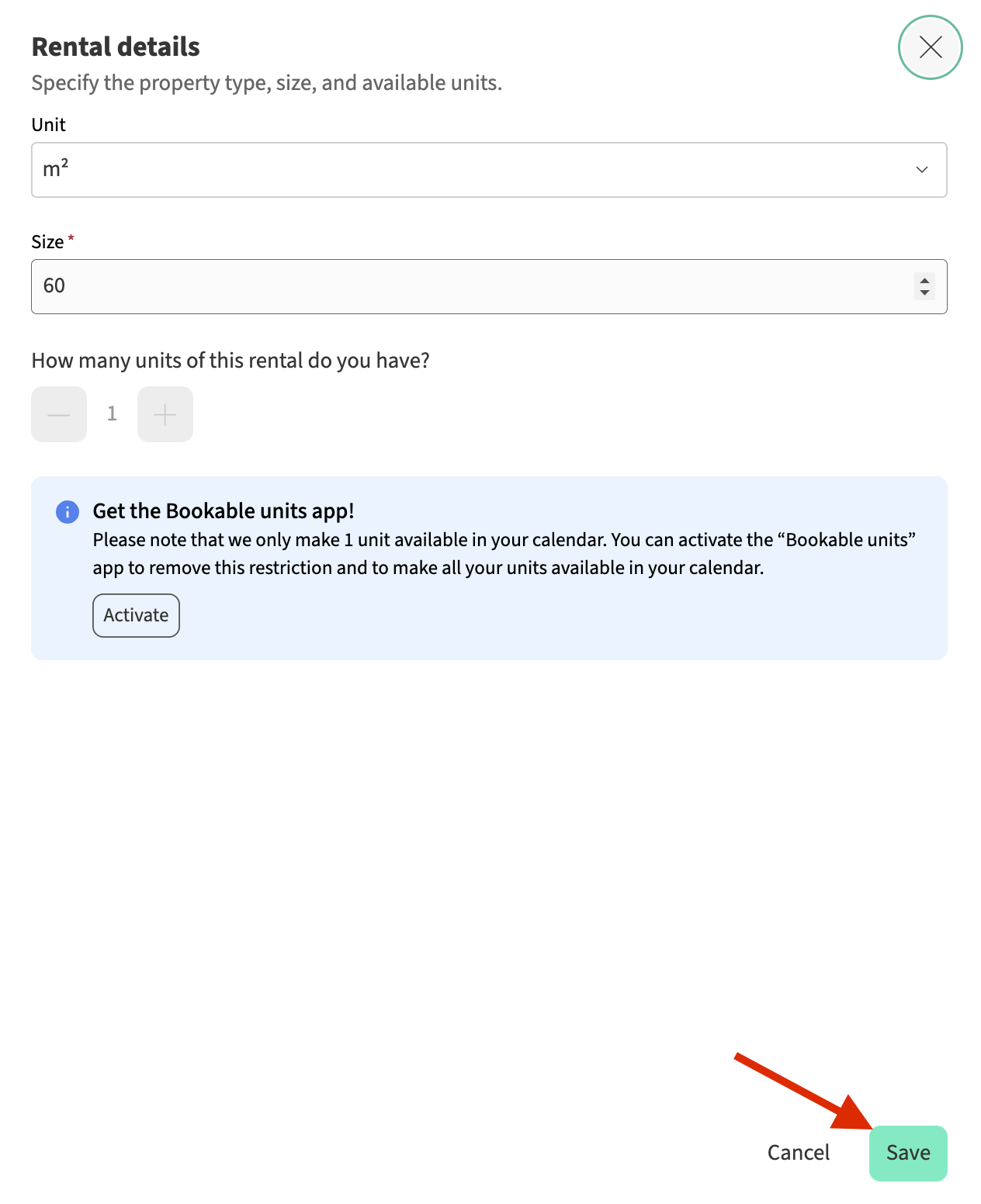 Informez les invités sur la taille de l'hébergement et combien d'unités vous avez (ne confondez pas les Unités avec le nombre de pièces que votre appartement peut avoir). 💡 Note : Si votre application Bookable Units n'est pas encore activée, vous verrez un avertissement, qu'un seul logement sera disponible dans votre calendrier. En savoir plus sur l'application Bookable Units. |
