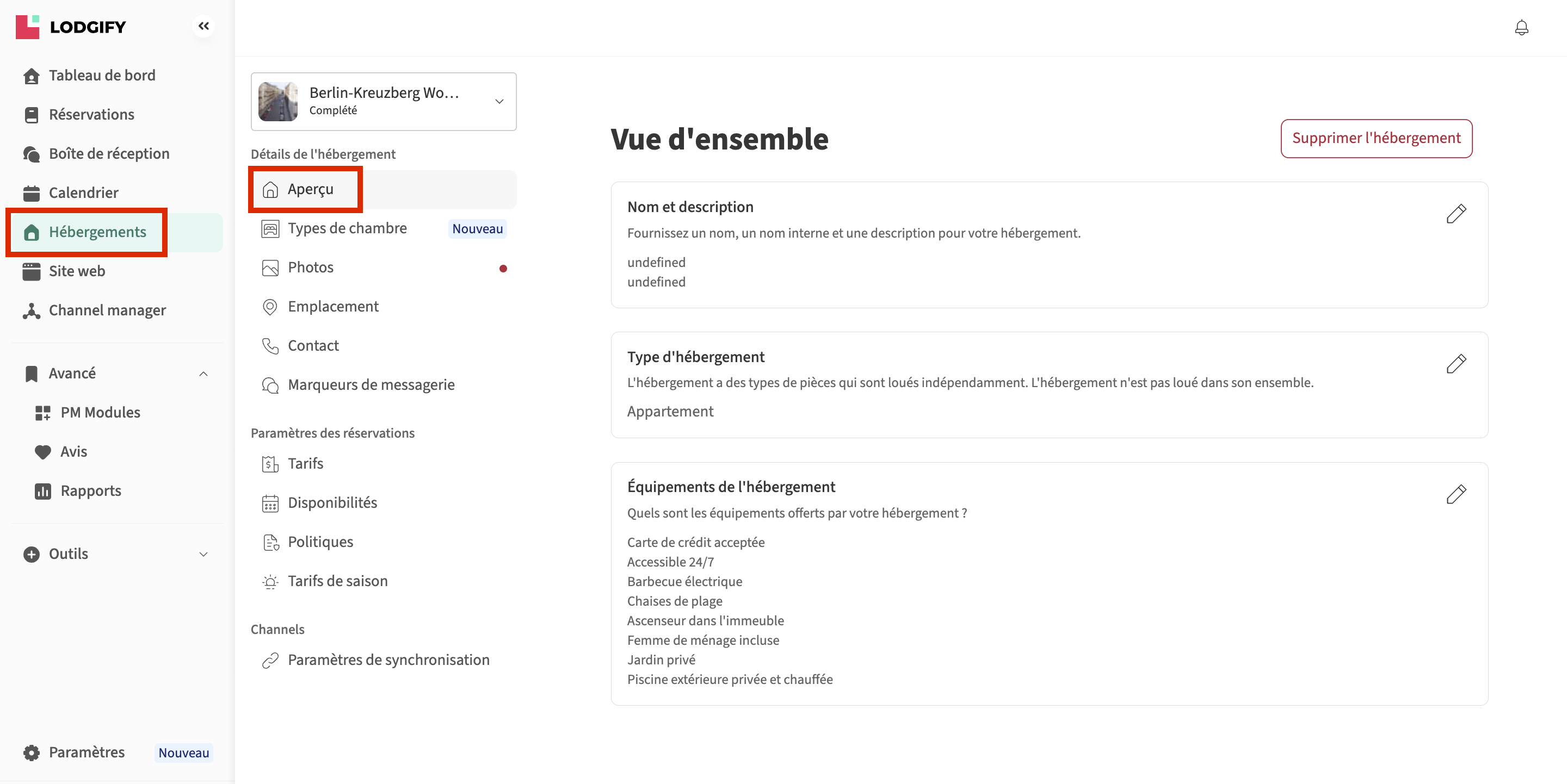 Pour modifier les informations générales et les équipements de vos Hébergements au cas où vous auriez configuré plusieurs types de logements :