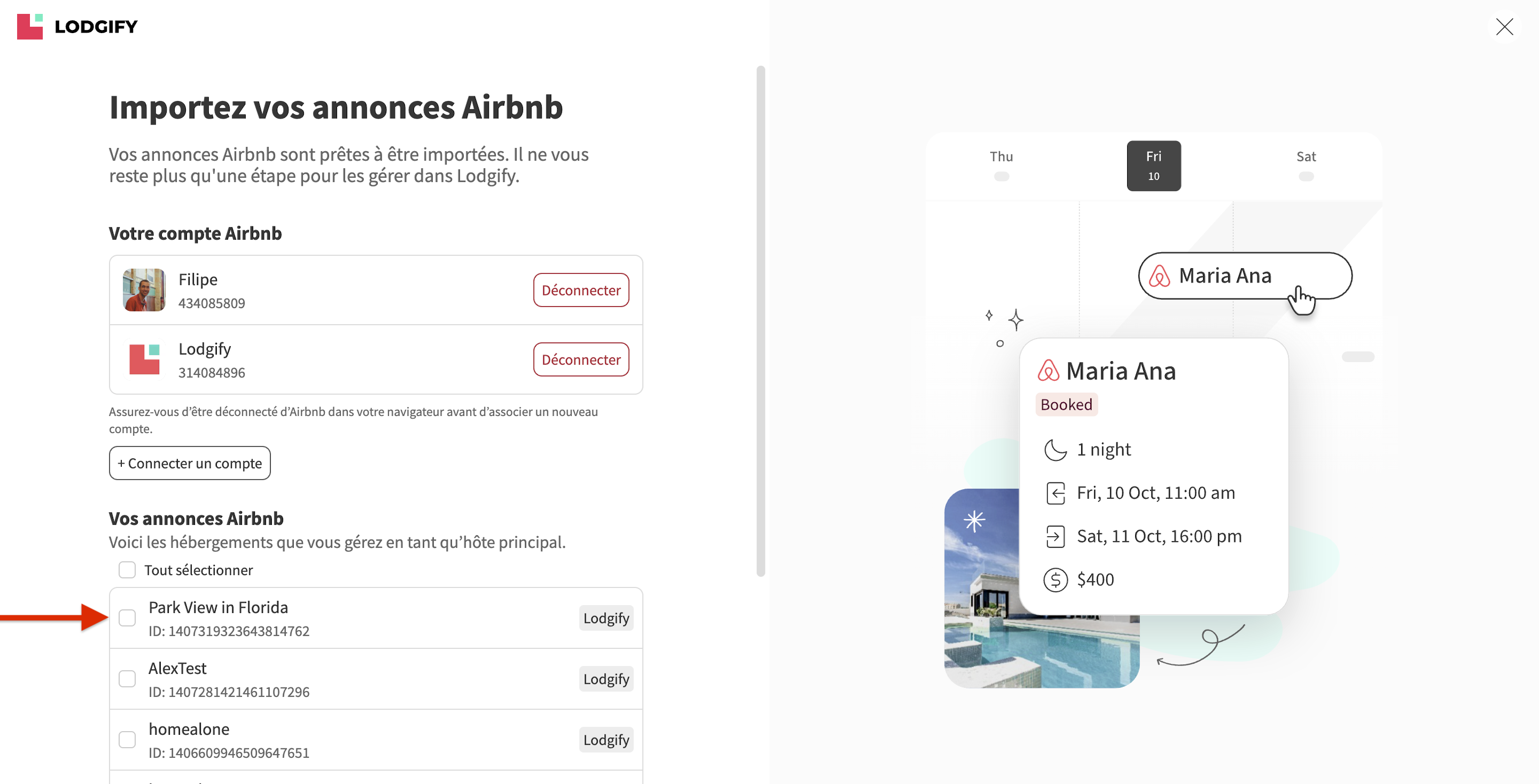 - Vous pouvez maintenant revenir à votre fenêtre Lodgify, où vos annonces Airbnb apparaîtront. Sélectionnez les logements que vous souhaitez importer.