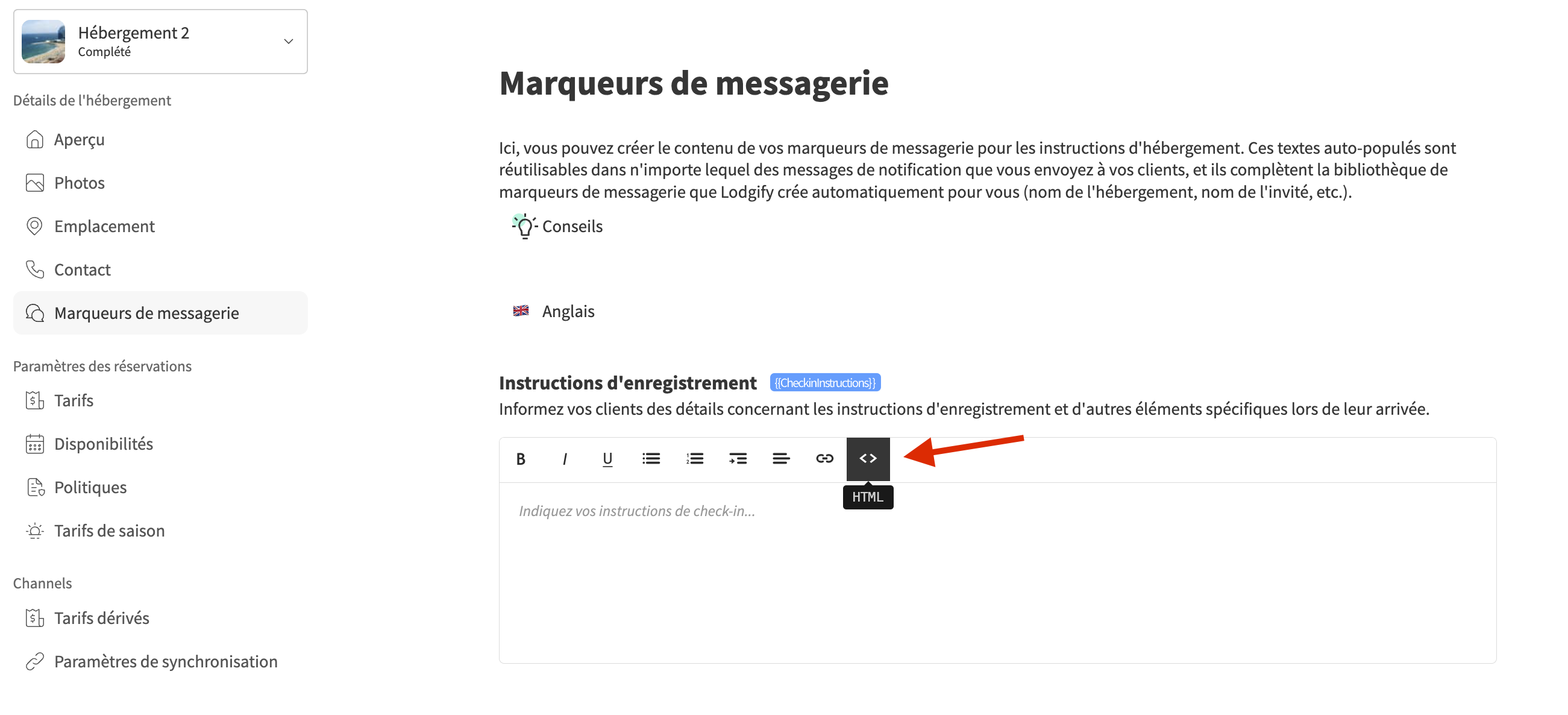 💡 Note : Pour consulter la liste complète des marqueurs de messagerie disponibles et leurs détails, y compris les marqueurs prédéfinis de Lodgify, consultez cet article.