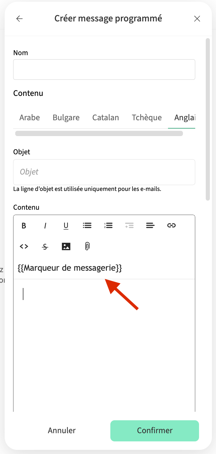 Utiliser les marqueurs de messagerie dans les messages programmés et les réponses rapides