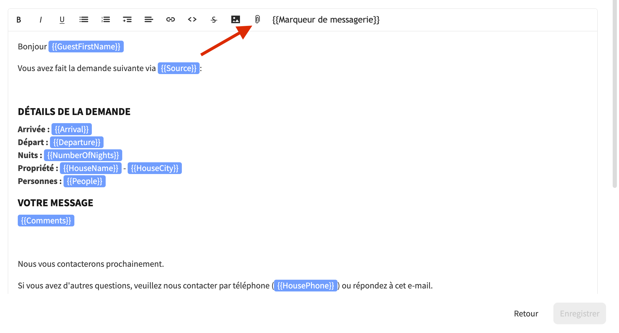 ⚠ Attention : Airbnb n'autorise pas l'envoi de pièces jointes via la messagerie API. Par conséquent, cette fonctionnalité ne fonctionnera pas pour les notifications Airbnb. Les autres OTA devraient fonctionner normalement avec les pièces jointes.