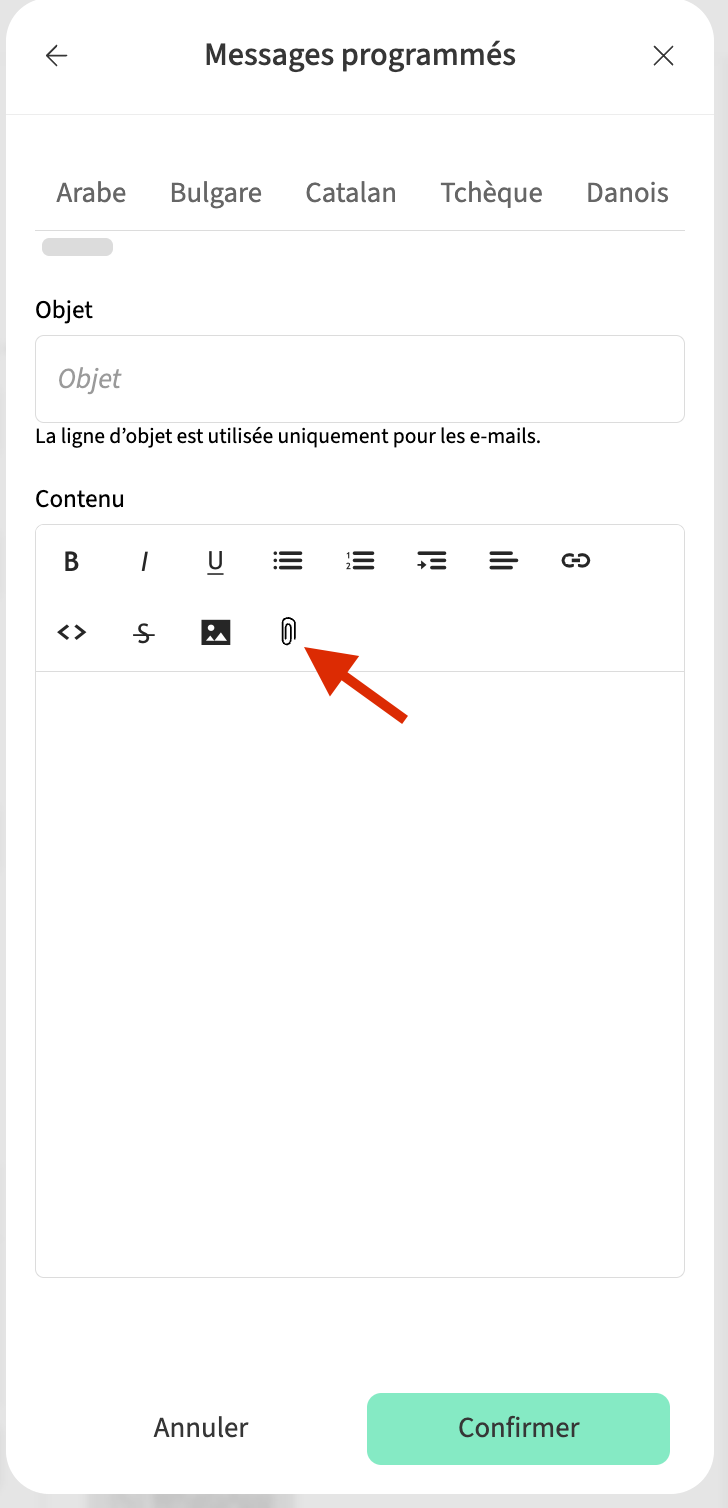 - Une fois que vous êtes dans l'éditeur de texte du message, cliquez sur l'icône de pièce jointe. Une fenêtre s'ouvrira où vous pourrez glisser-déposer ou télécharger vos fichiers depuis votre ordinateur.
