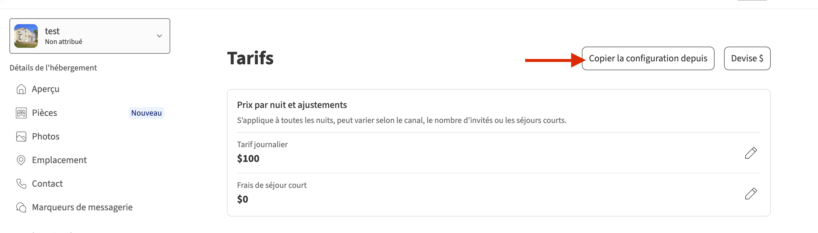 Si vous avez plusieurs hébergements et que vous souhaitez appliquer les mêmes paramètres de réservation, vous pouvez utiliser la fonction Copier la configuration. Cette fonctionnalité vous permet d'importer les prix, frais et taxes d’un autre hébergement, ce qui vous fait gagner beaucoup de temps lors de la configuration.