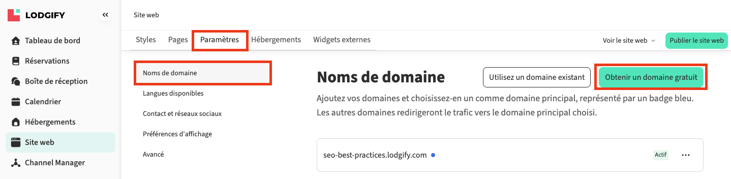 - Vous pouvez enregistrer un domaine gratuit avec les offres annuelles ou bi-annuelles de Lodgify.