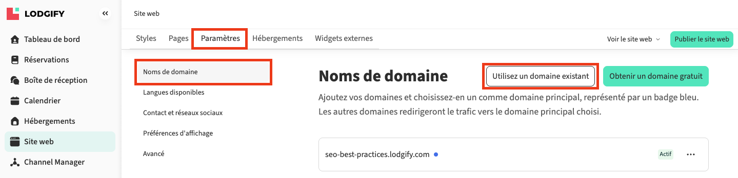 - Ou vous pouvez lier un domaine existant si vous possédez déjà un domaine (par ex. GoDaddy, Namecheap, etc.) et le lier à Lodgify.