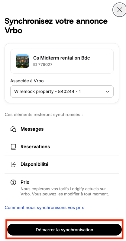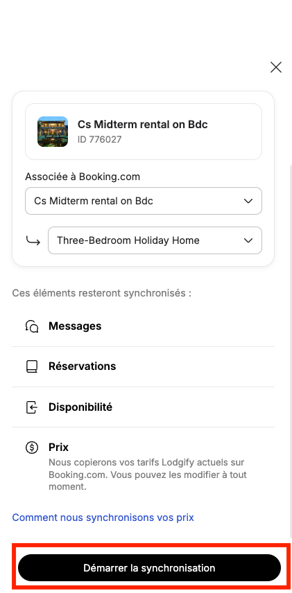 - Cliquez sur Démarrer la synchronisation pour commencer le processus de Mapping (Comment nous synchronisons vos prix explique comment vos paramètres de Tarifs Lodgify sont synchronisés et appliqués).