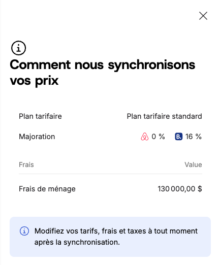 Note : Une Majoration du canal de 16 % est automatiquement appliquée aux prix de votre propriété sur Booking.com. Après la connexion, vous pouvez modifier cette majoration dans les paramètres de synchronisation Booking.com.