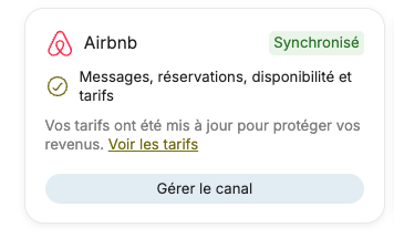 Une fois la connexion terminée, votre logement apparaîtra comme Synced et vous pourrez cliquer sur Manage Channel pour vérifier et modifier les paramètres de votre canal Airbnb.