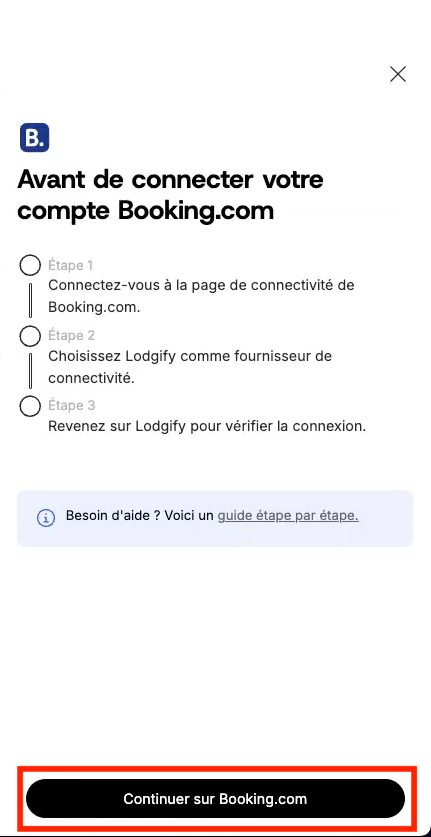 Une fois la connexion Airbnb terminée, vous pouvez suivre le même flux simplifié pour connecter votre logement à Booking.com.