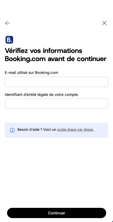 - Saisissez votre adresse e-mail Booking.com et votre Identifiant d'entité légale de votre compte (disponible dans votre Extranet Booking.com).