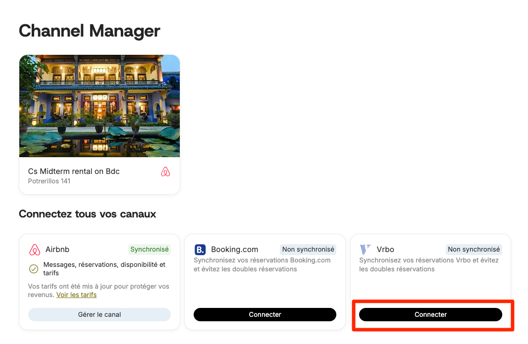 Si vous avez un seul logement, vous pouvez utiliser un flux de connexion simplifié qui vous permet de connecter votre logement à Airbnb, Booking.com et Vrbo en un seul processus.