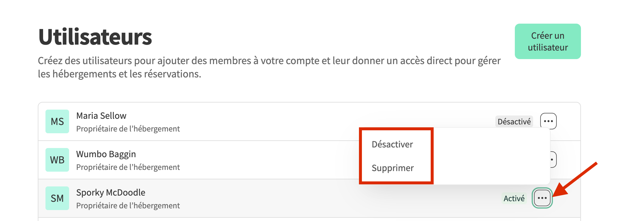 - Dans la liste des utilisateurs, cliquez sur l’icône des trois petits points à côté de En Attente / Activé, puis sélectionnez Supprimer ou Désactiver dans le menu déroulant.