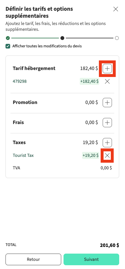💡 Note : Sur l'application mobile, vous pouvez également définir un nombre d'invités par défaut. - Sur la page suivante, examinez les détails du prix et les suppléments. Vous pouvez utiliser les icônes du plus ou de la croix si vous devez modifier quelque chose, puis cliquez sur Suivant.