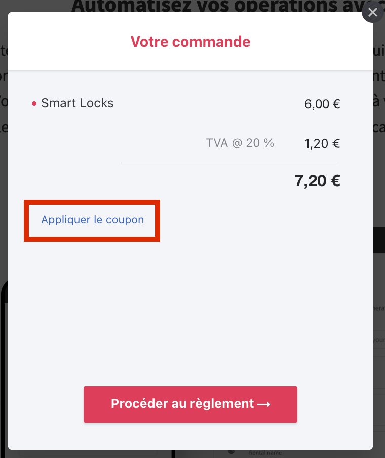 Si vous avez un code promo pour acheter, mettre à niveau votre abonnement Lodgify ou ajouter des éléments liés à la facturation, assurez-vous de l’appliquer correctement avant de finaliser votre achat.